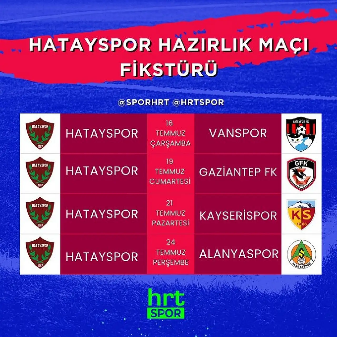 Hatayspor ile Kayserispor arasında oynanacak olan hazırlık maçı da 21 Temmuz olarak belirlendi. Karşılaşma Erciyes Yüksek İrtifa Kamp Merkezinde saat 17.00’de başlayacak. Bu maçın taraftarlara açık olup olmayacağı açıklanmadı.