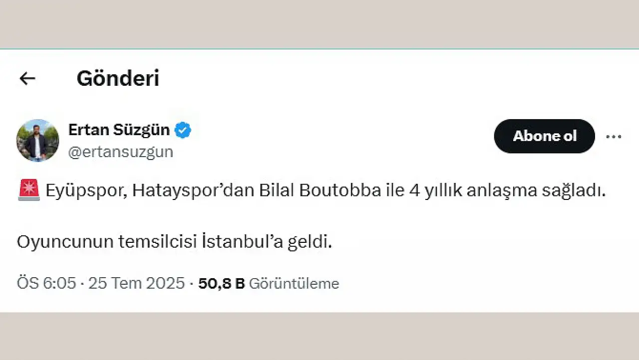 Geçtiğimiz sezon Arda Turan yönetiminde ligin flaş takımı olan Eyüpspor, Fransız futbolcuyla anlaşma sağladı. Süzgün, paylaşımında, “Eyüpspor, Hatayspor’dan Bilal Boutobba ile 4 yıllık anlaşma sağladı. Oyuncunun temsilcisi İstanbul’a geldi” bilgisi verdi. Fransız futbolcunun adı Beşiktaş ile de anılmıştı.