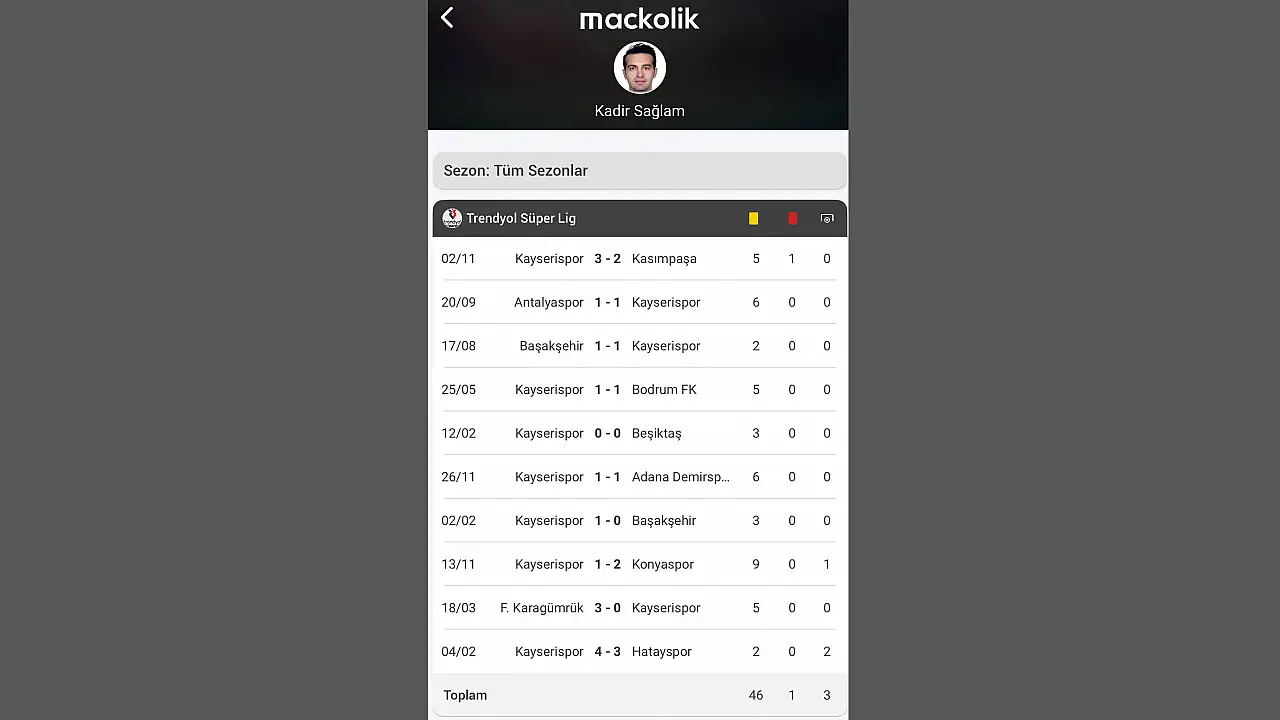 Bu zamana kadar Kayserispor’un 10 Süper Lig maçını yöneten Kadir Sağlam, Kocaelispor müsabakasıyla sarı-kırmızılı ekibin 11. maçını yönetecek. Kadir Sağlam’ın yönettiği 10 maçta Kayserispor 3 galibiyet, 5 beraberlik ve 2 yenilgi elde etti. Bu maçlarda Sağlam tarafından Kayserisporlu futbolculara toplam 27 sarı kart, teknik adam Radomir Djalovic’e de 1 kırmızı kart çıktı.