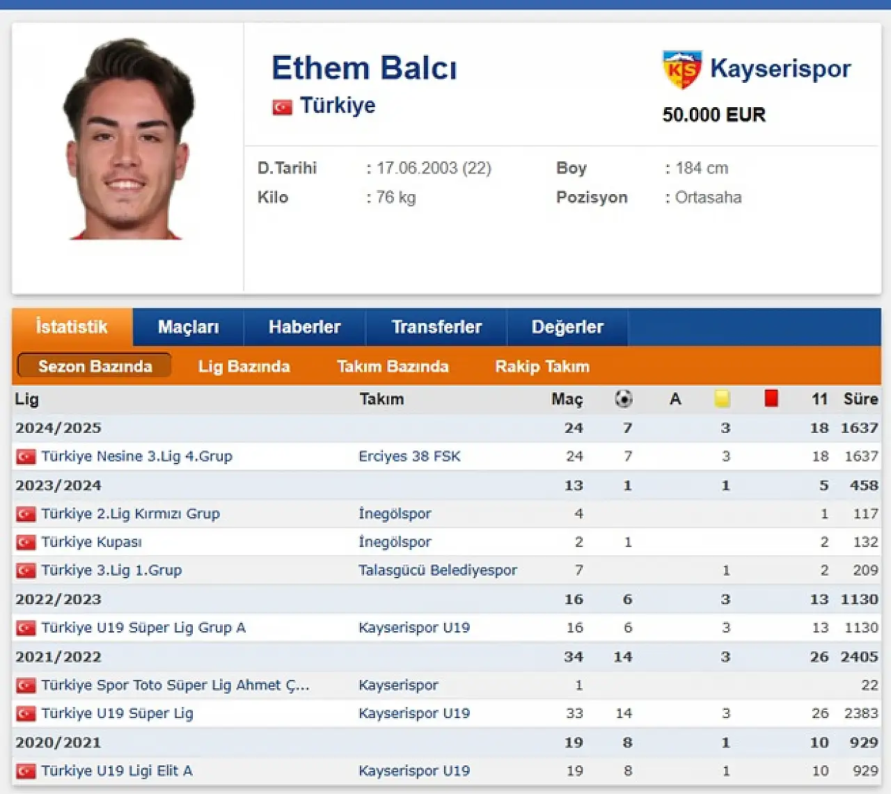 Kayserispor'un genç yeteneği Ethem Balcı (22), geçtiğimiz sezon kiralık olarak oynadığı Erciyes 38 FK'da gösterdiği performansla dikkatleri üzerine çekmişti. 2027'ye kadar sözleşmesi bulunan futbolcu, Kayserispor'un sezon öncesi kampında yer alıyor ve Markus Gisdol'un gözetiminde patlama yapması bekleniyor.