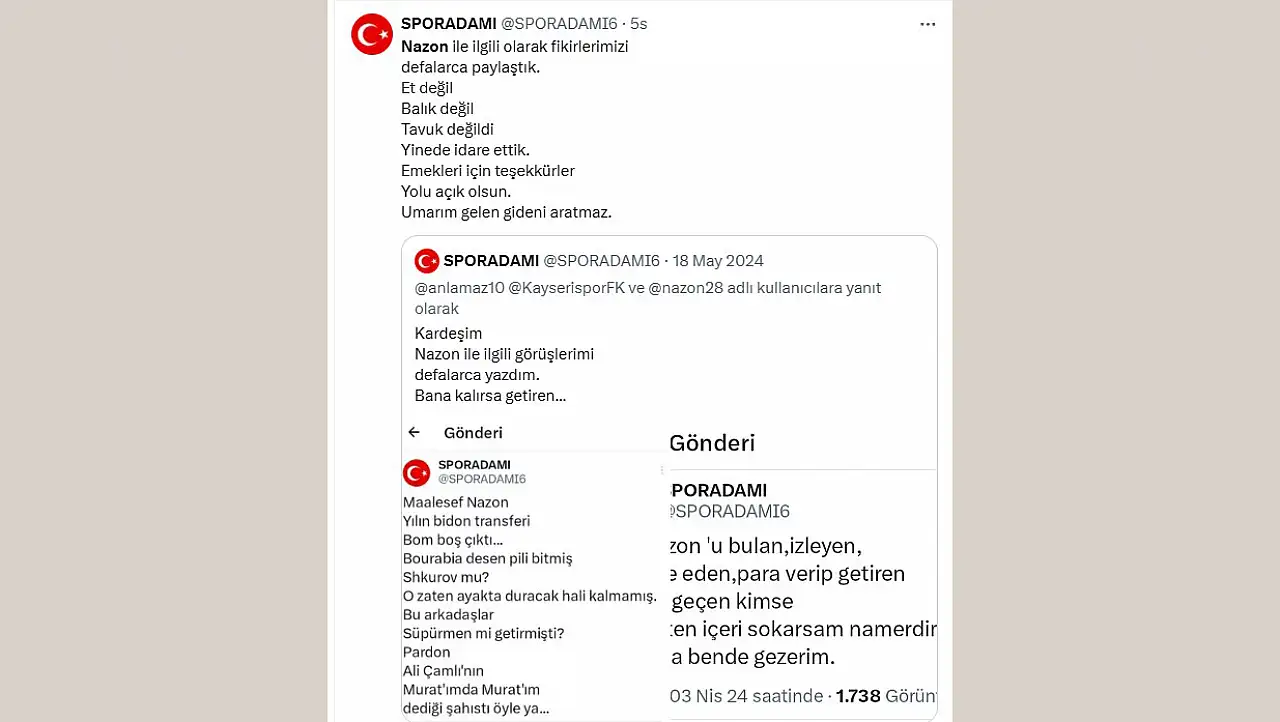 Kayserispor taraftarı Spor Adamı da yine paylaşımlarıyla dikkatleri üzerine topladı. Spor Adamı, “Nazon ile ilgili olarak fikirlerimizi defalarca paylaştık. Et değil, balık değil, tavuk değildi. Yine de idare ettik, emekleri için teşekkürler. Yolu açık olsun, umarım gelen gideni aratmaz” dedi.