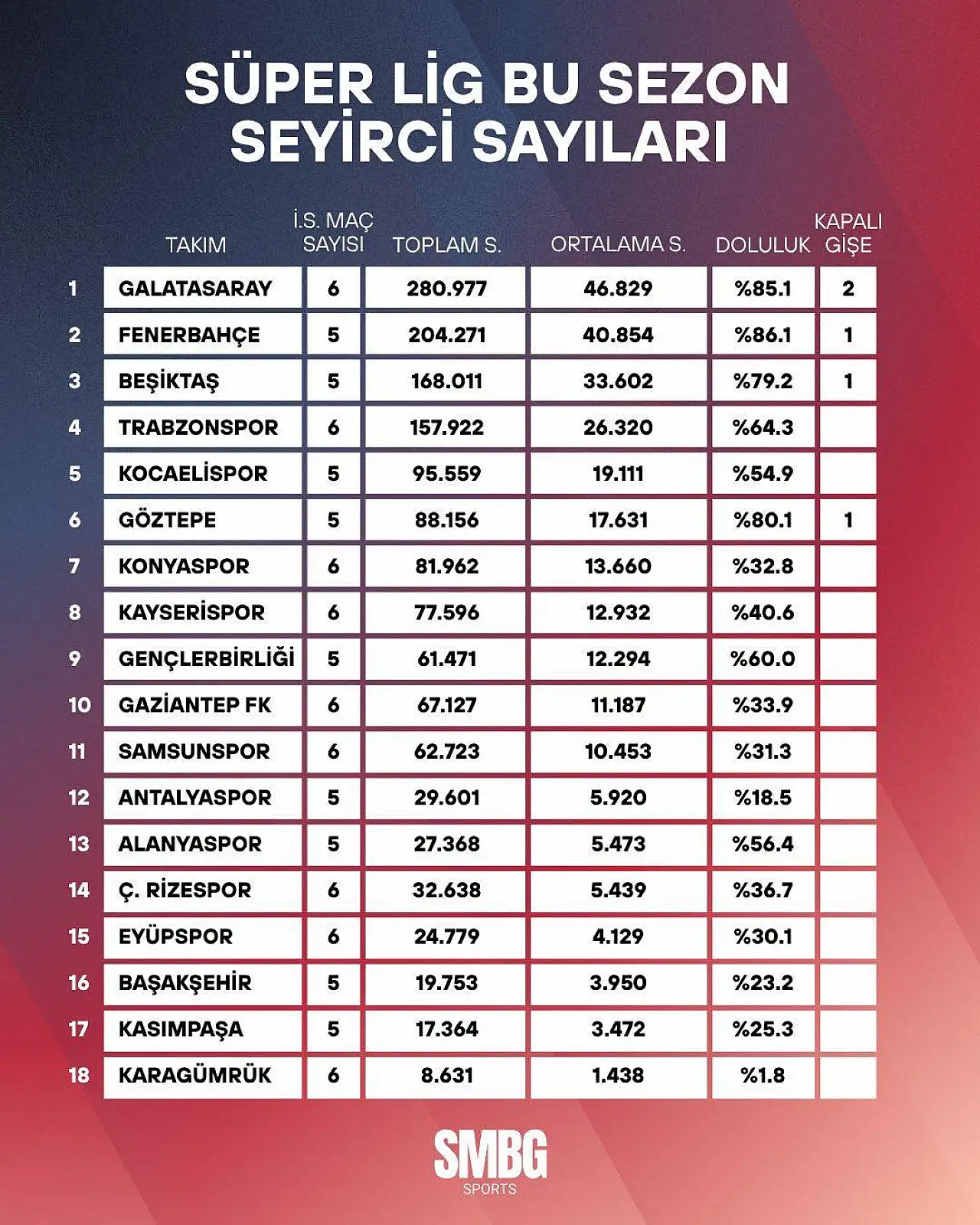 1 Galatasaray – 6 maç, 280.977 toplam seyirci, 46.829 ortalama, %85,1 doluluk