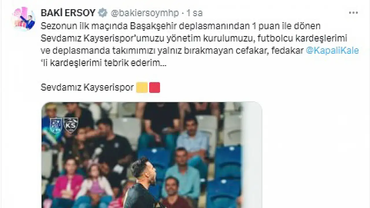 Ersoy, “Sezonun ilk maçında Başakşehir deplasmanından 1 puan ile dönen Sevdamız Kayserispor’umuzu, yönetim kurulumuzu, futbolcu kardeşlerimi ve deplasmanda takımımızı yalnız bırakmayan cefakar, fedakar Kapalı Kale‘li kardeşlerimi tebrik ederim… Sevdamız Kayserispor” ifadelerini kullandı.
