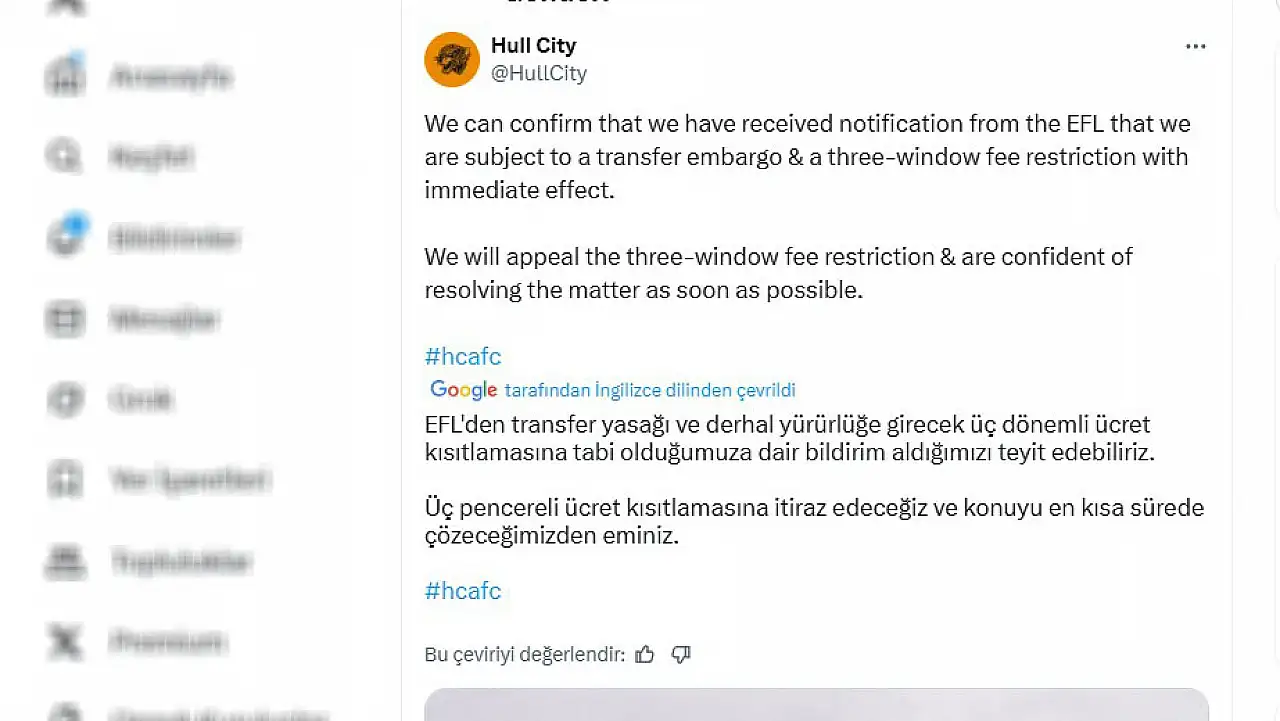 Başkanlığını Acun Ilıcalı’nın yaptığı Hull City’ye, 3 dönem transfer yasağı geldi. İngiliz Futbol Ligi (EFL), Hull City’nin Aston Villa’ya 1 milyon Euro borcu olduğunu öğrendi. Bu borç nedeniyle FIFA, Hull City’ye 3 transfer dönemi boyu ceza verdi.
