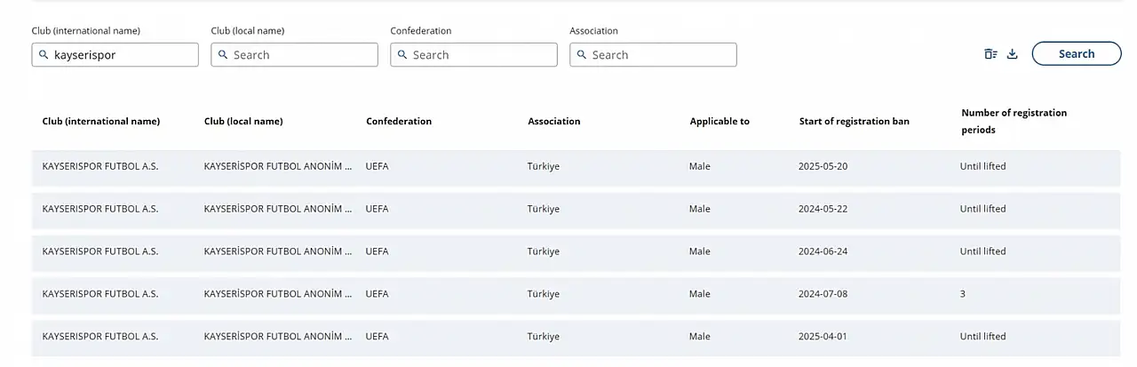 FIFA'nın resmi sitesinde Kayserispor'un 5 dosyasının kaldığı ve bu listenin yakın zamanda kapanacağı tahmin ediliyor.
