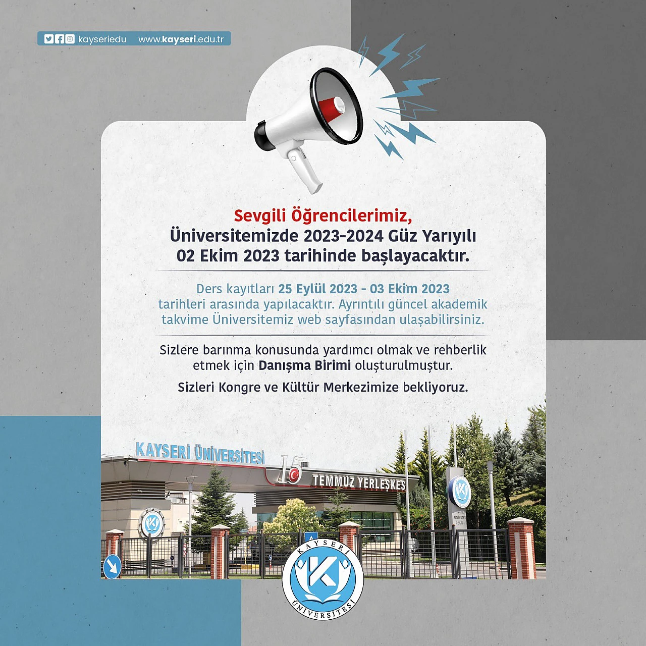 Kayseri Üniversitesi, 2023-2024 Güz Yarıyılı'nın başlangıç tarihini ve ders kayıt dönemi detaylarını duyurdu. Öğrencilere barınma konusunda yardımcı olacak yeni bir "Danışma Birimi" de oluşturuldu.