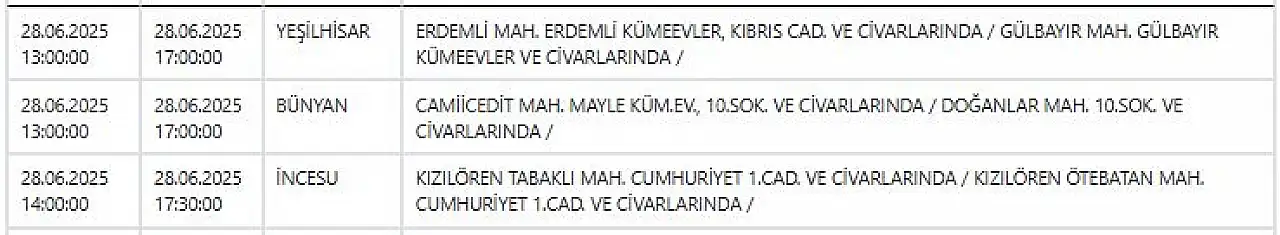 KCETAŞ’tan edinilen bilgilere göre yarın (28 Haziran 2025) aşağıdaki ilçe ve mahallelerde elektrik kesintisi yaşanacak.