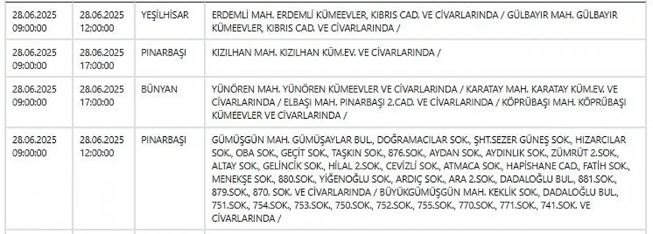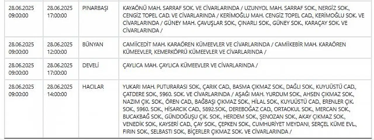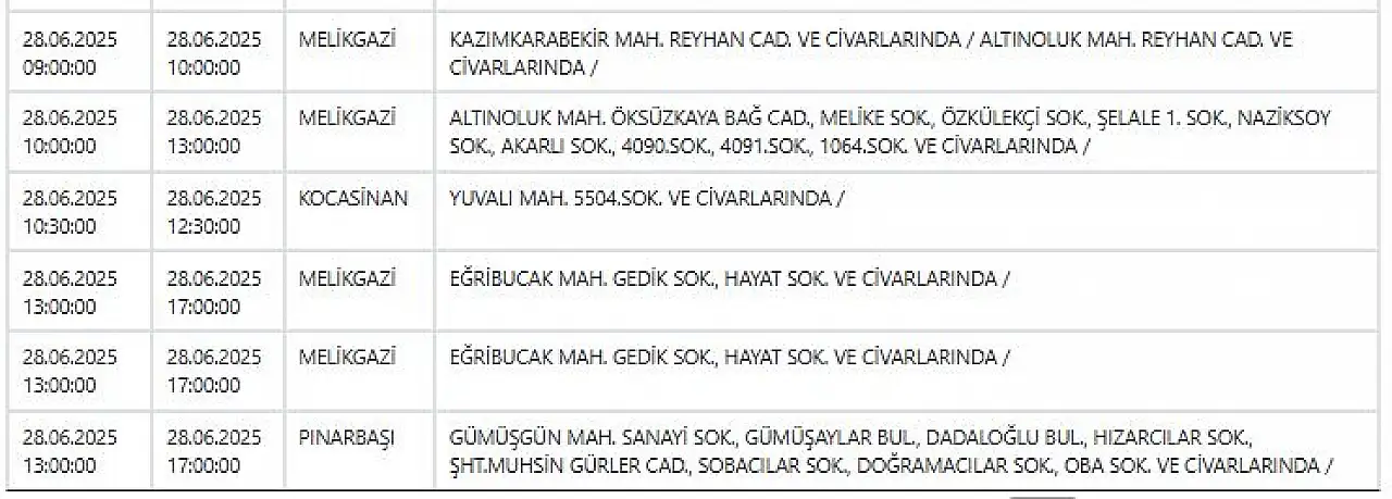 KCETAŞ duyurdu: 28 Haziran 2025 Kayseri'de elektrik kesintisi yaşanacak ilçe ve mahalleler...
