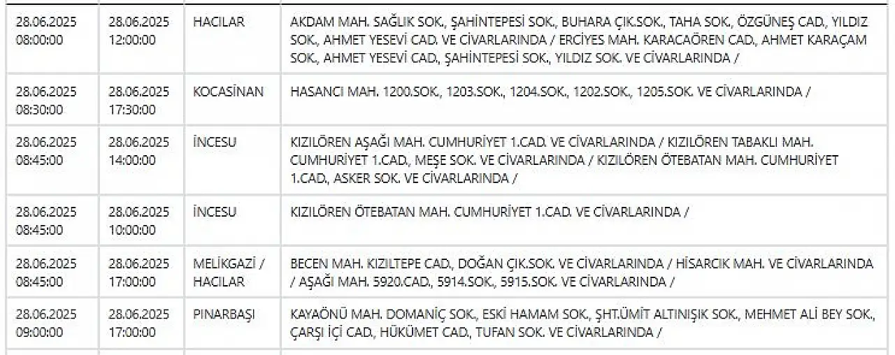 - KCETAŞ duyurdu: 28 Haziran 2025 Kayseri'de elektrik kesintisi yaşanacak ilçe ve mahalleler...