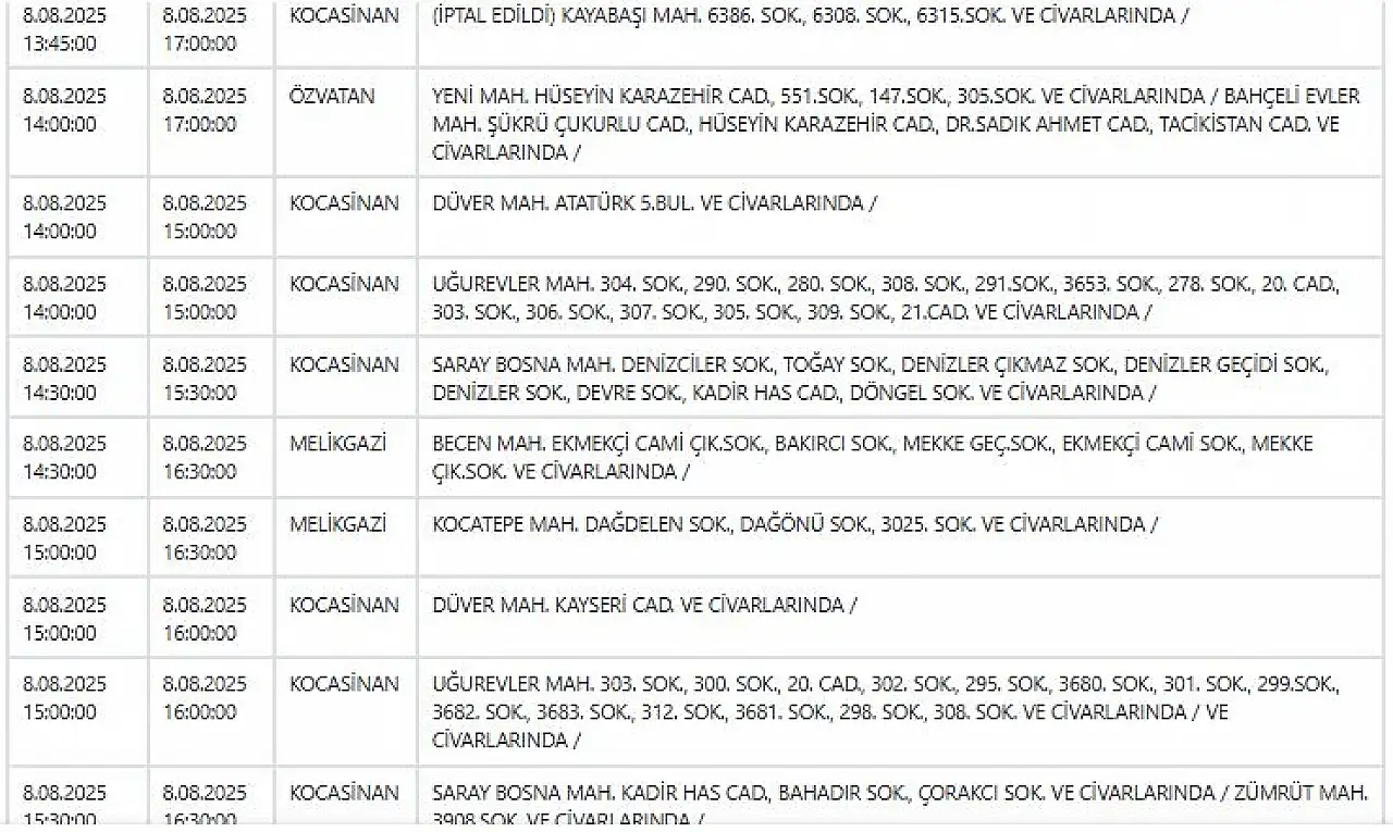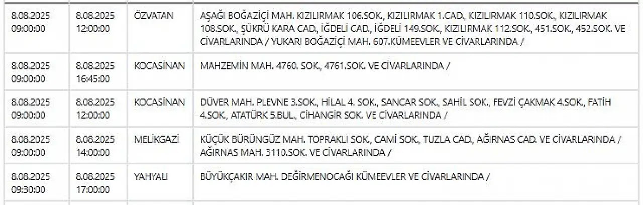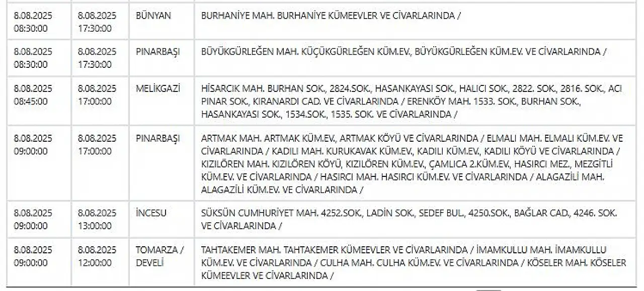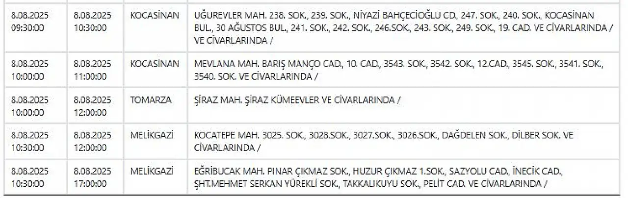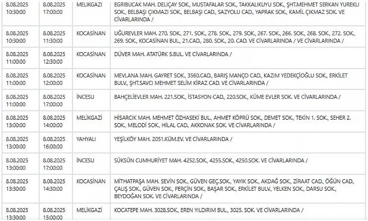KCETAŞ’tan edinilen bilgilere göre yarın (8 Ağustos 2025) aşağıdaki mahallelerde elektrik kesintisi yaşanacak.