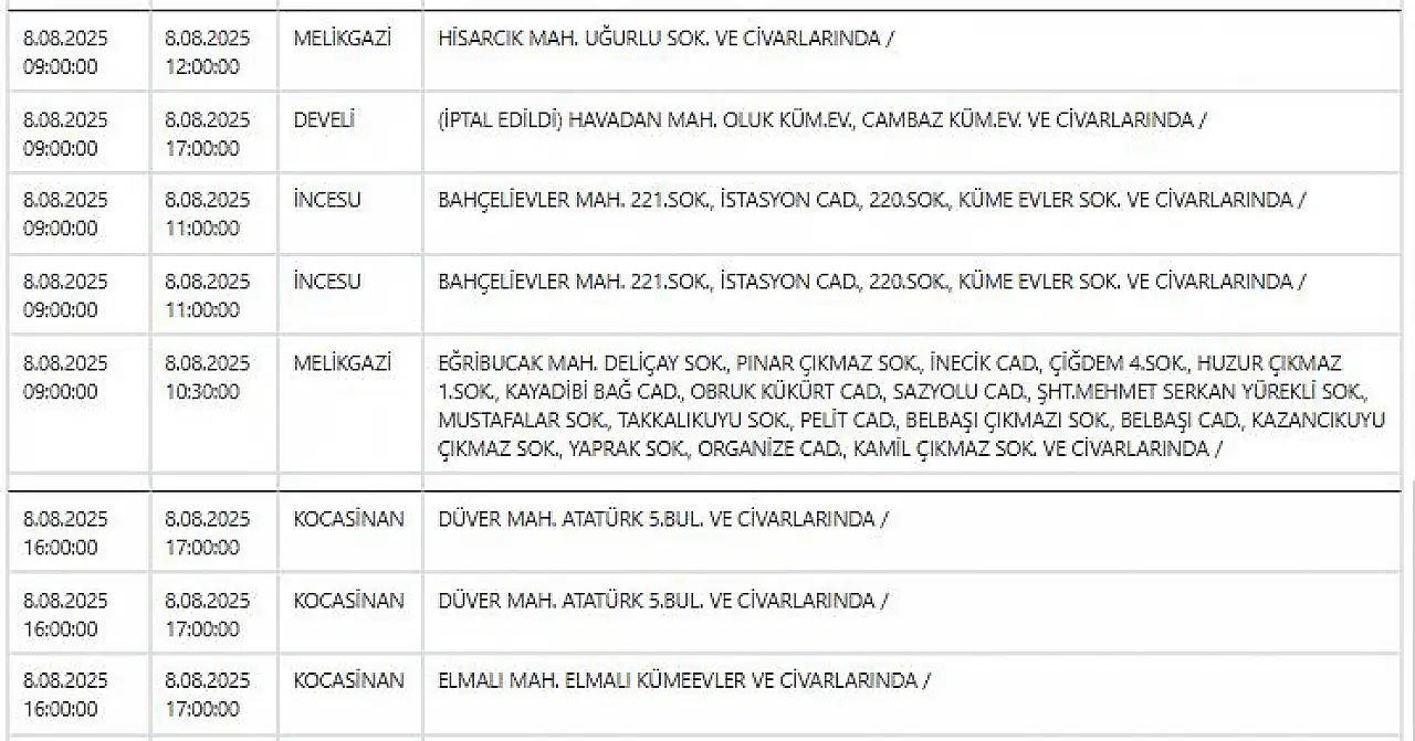 KCETAŞ Kayseri’de gerçekleştirilen çalışmalar kapsamında vatandaşlara bazı mahallelerde elektrik kesintisinin yaşanacağı uyarısında bulundu. 8 Ağustos 2025 güncel kesintiler…