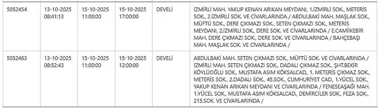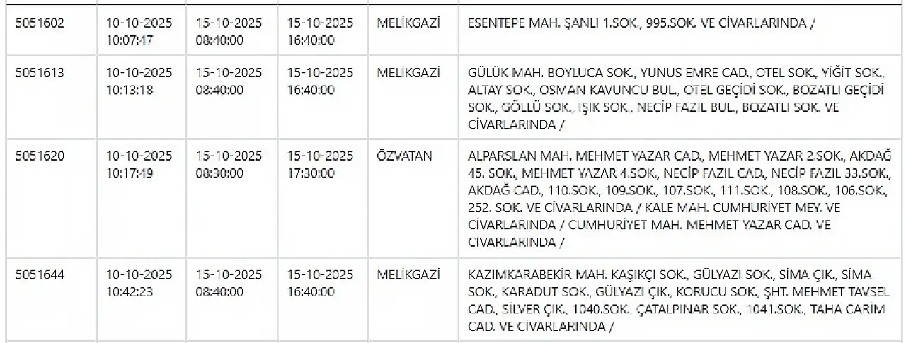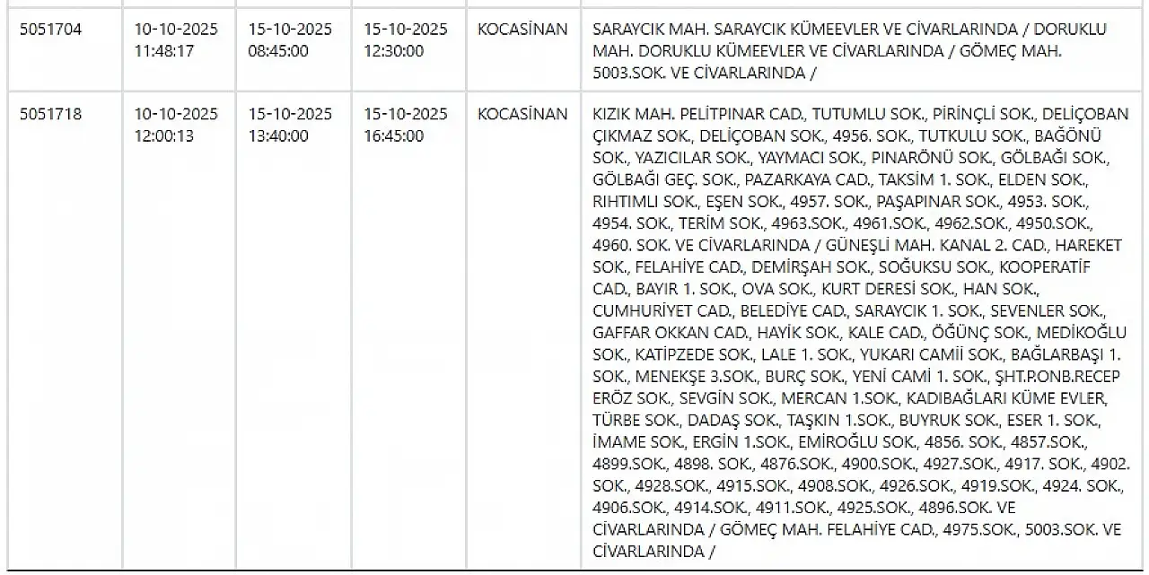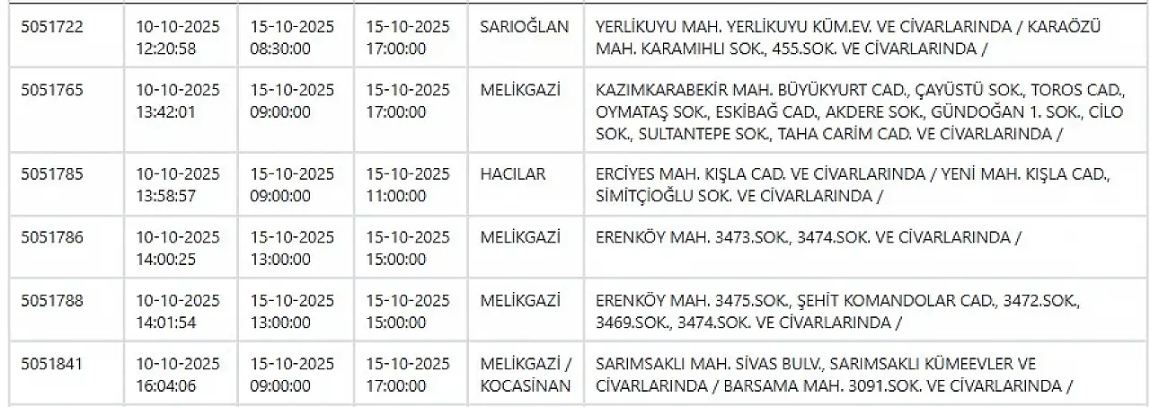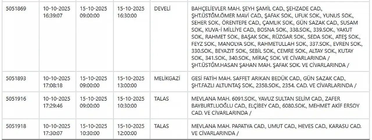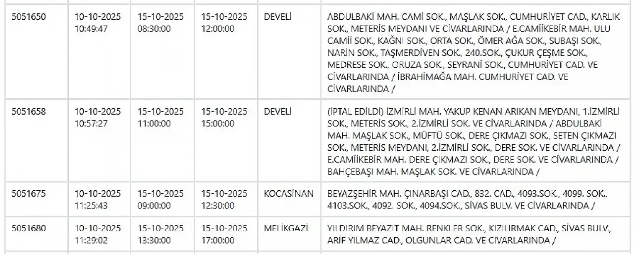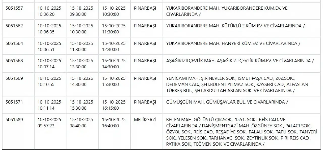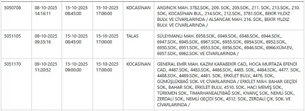 KCETAŞ’tan edinilen bilgilere göre yarın (15 Ekim 2025) aşağıdaki mahallelerde elektrik kesintisi yaşanacak.