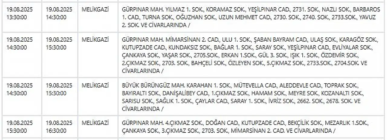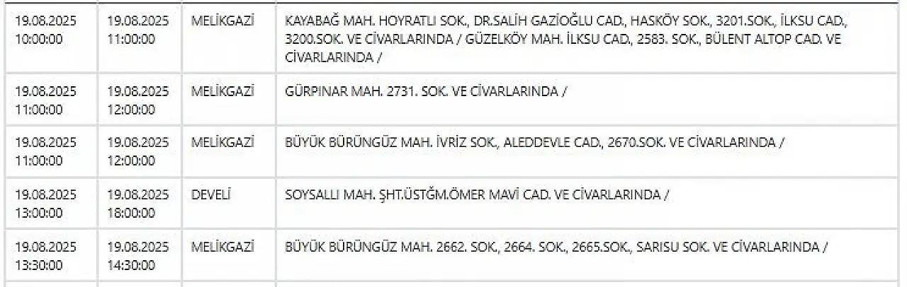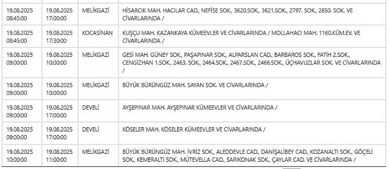 KCETAŞ’tan edinilen bilgilere göre yarın (19 Ağustos 2025) aşağıdaki mahallelerde elektrik kesintisi yaşanacak.