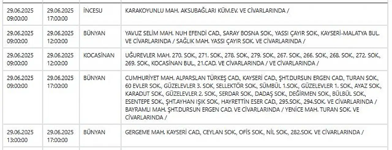 KCETAŞ’tan edinilen bilgilere göre yarın (29 Haziran 2025) aşağıdaki mahallelerde elektrik kesintisi yaşanacak.