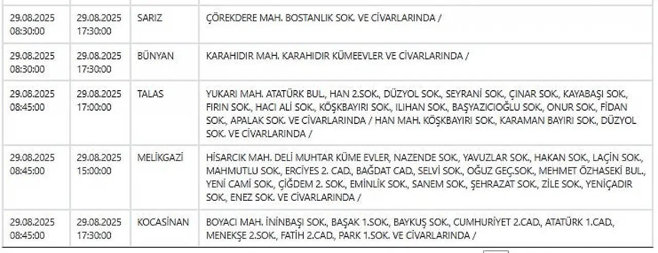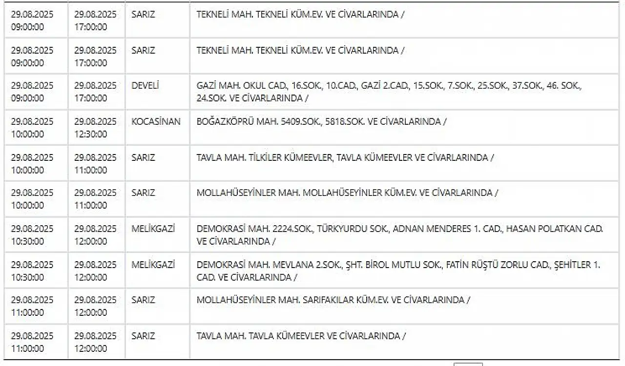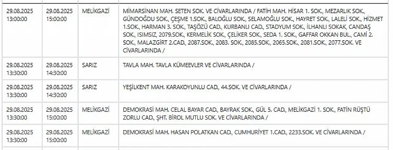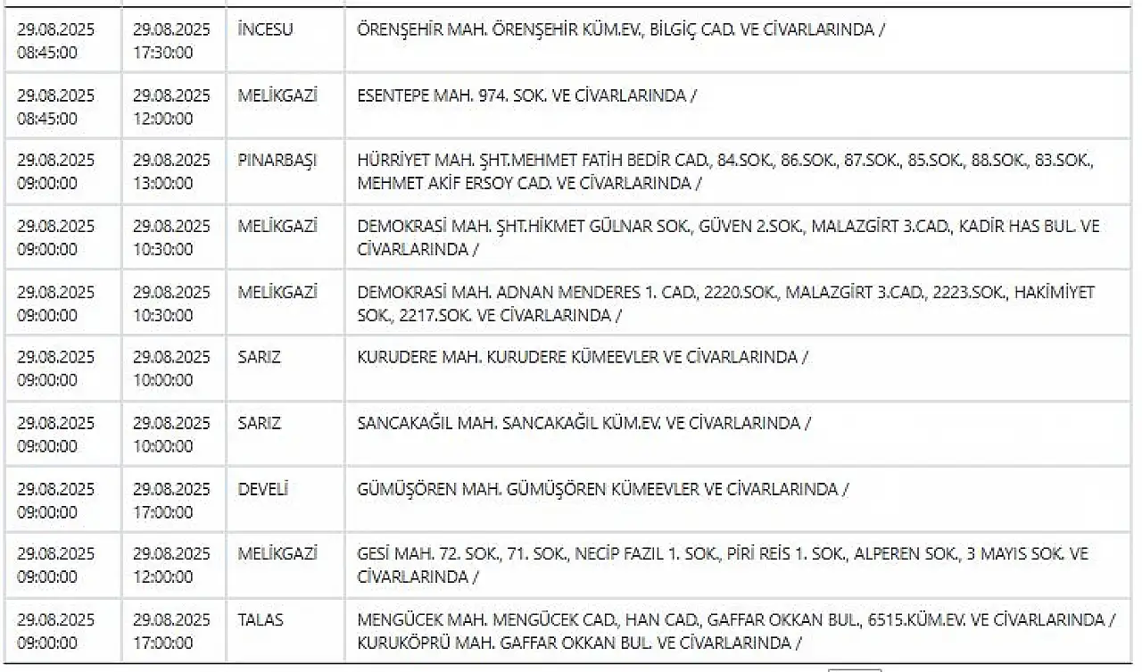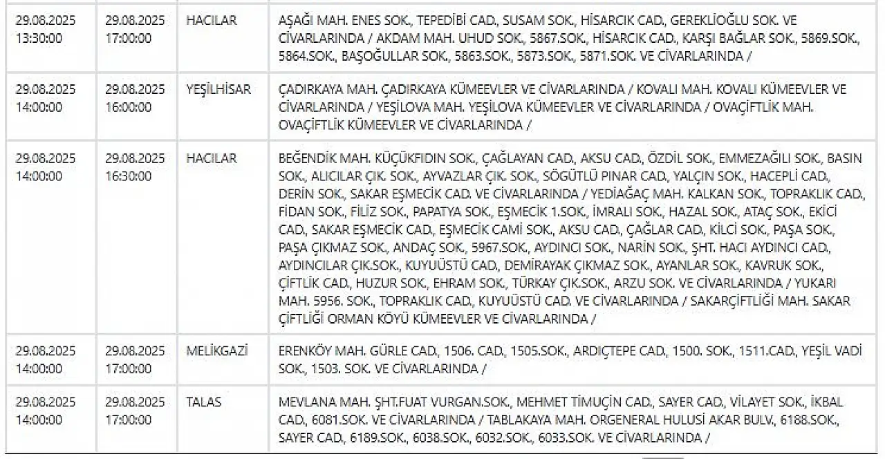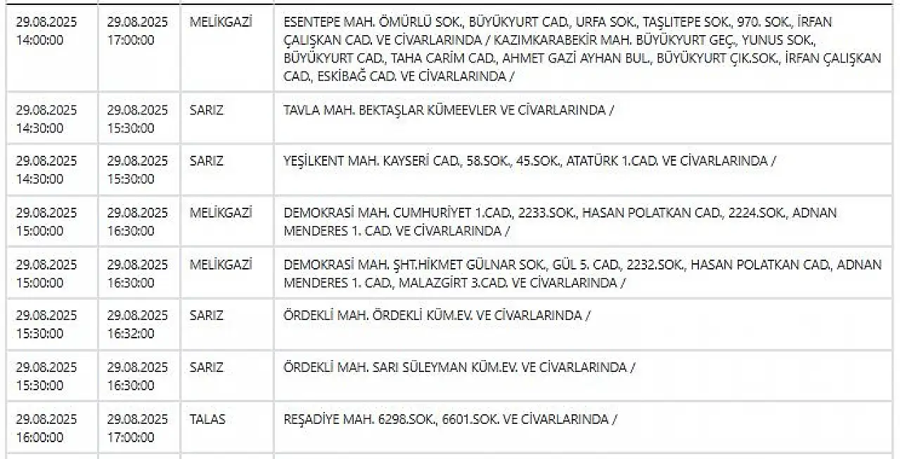 - KCETAŞ paylaştı: İşte Kayseri'de yarın elektrik kesintisi yaşanacak ilçeler! 29 Ağustos 2025
