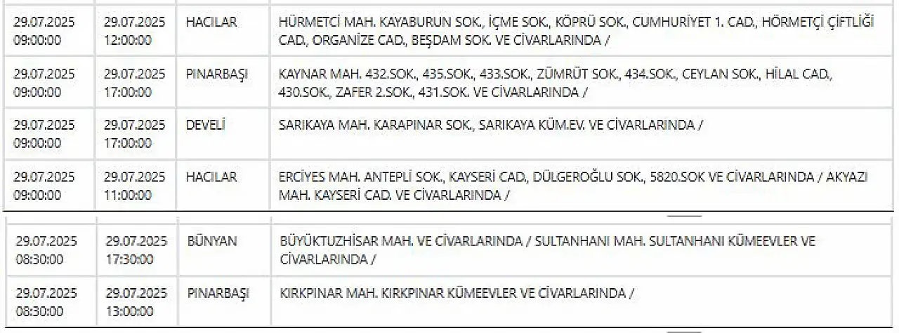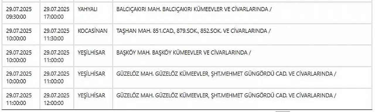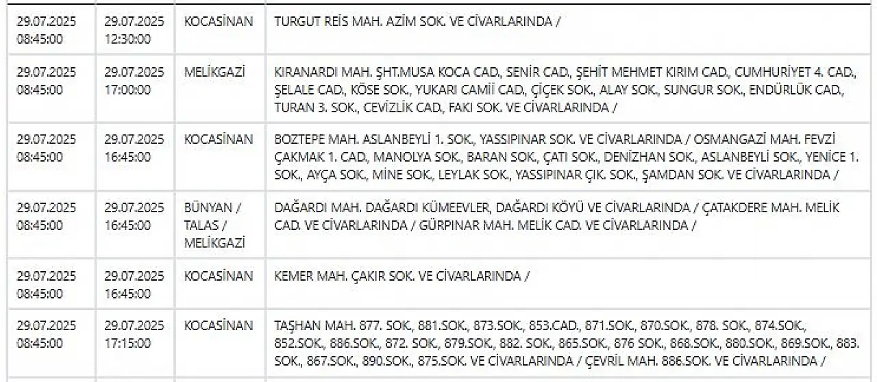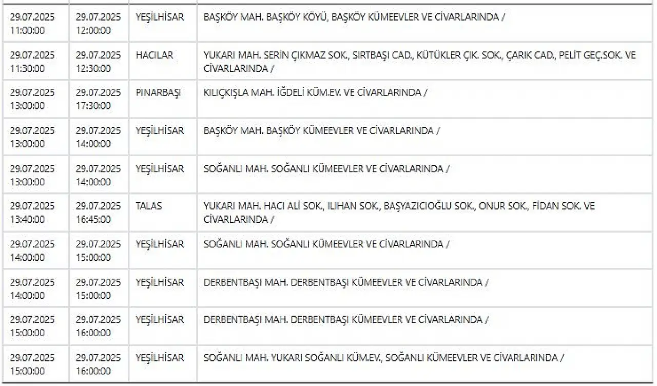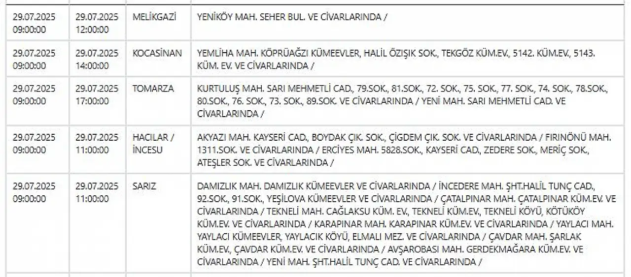 - KCETAŞ paylaştı: İşte Kayseri'de yarın elektrik kesintisi yaşanacak ilçeler! 29 Temmuz 2025