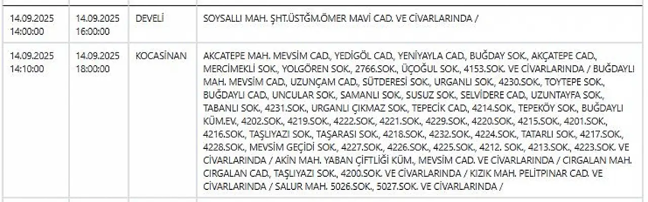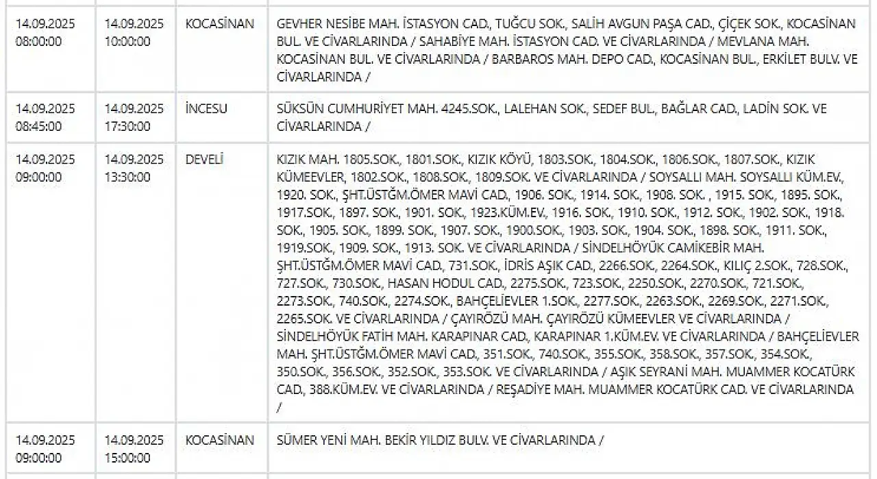 KCETAŞ’tan edinilen bilgilere göre yarın (14 Eylül 2025 tarihinde) aşağıdaki mahallelerde elektrik kesintisi yaşanacak.
