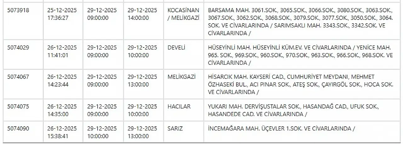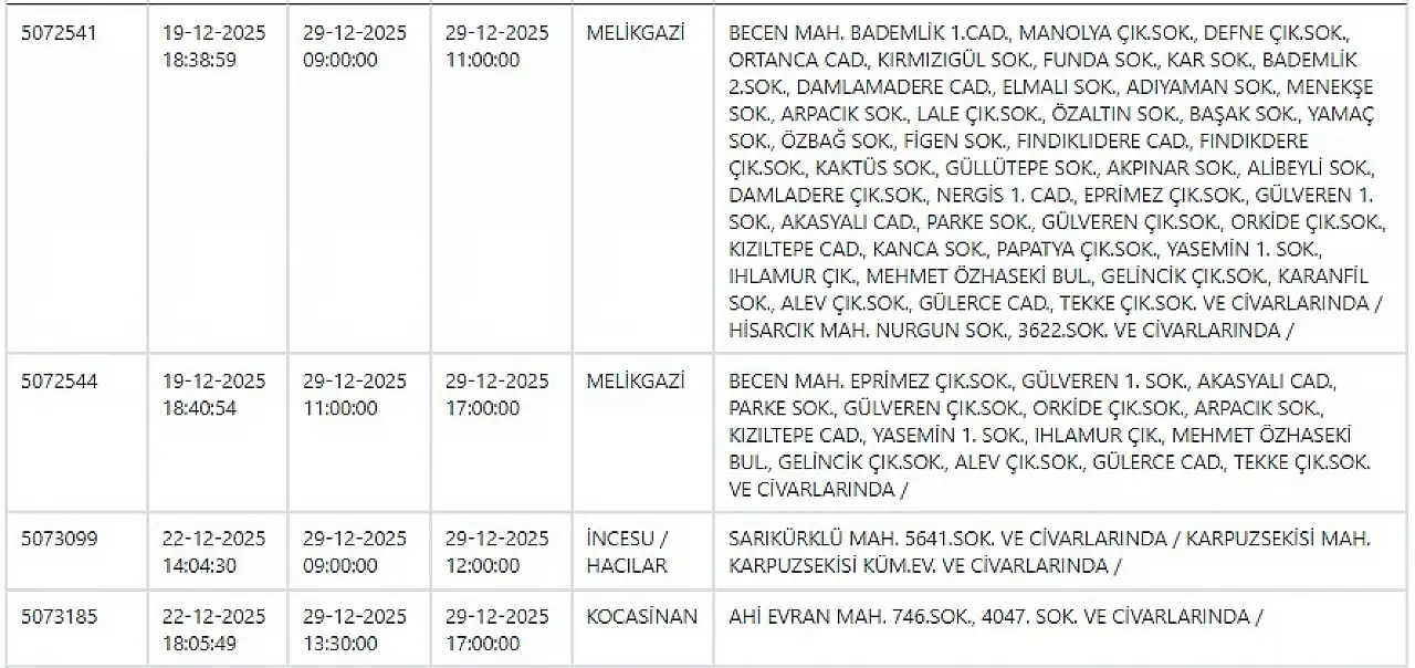 - KCETAŞ paylaştı: Kayseri'de haftanın ilk günü elektrik kesintisi yaşanacak ilçeler! 29 Aralık 2025