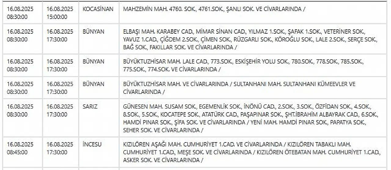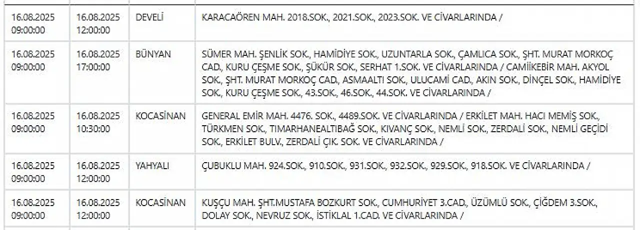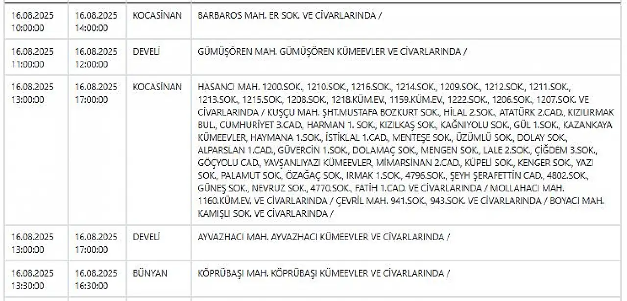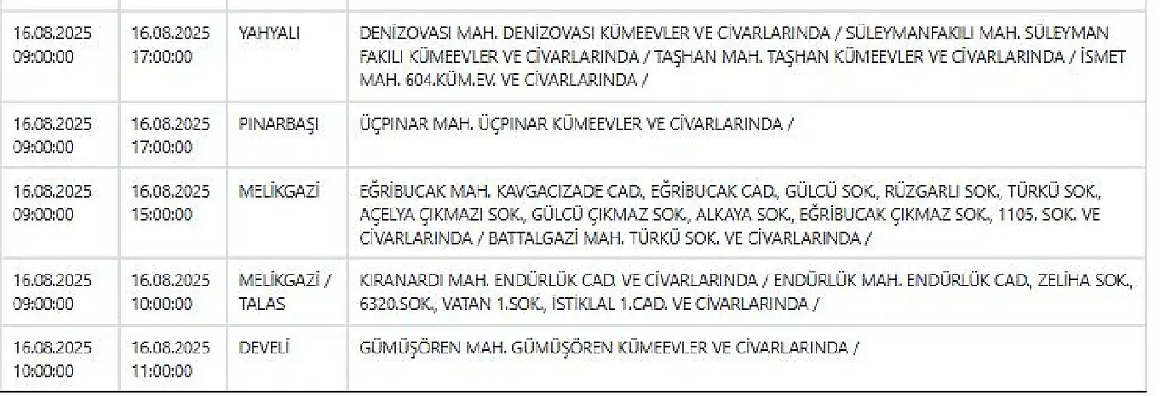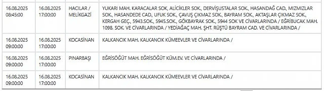 - KCETAŞ paylaştı: Kayseri'de yarın elektrik kesintisi yaşanacak ilçeler! 16 Ağustos 2025