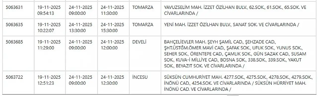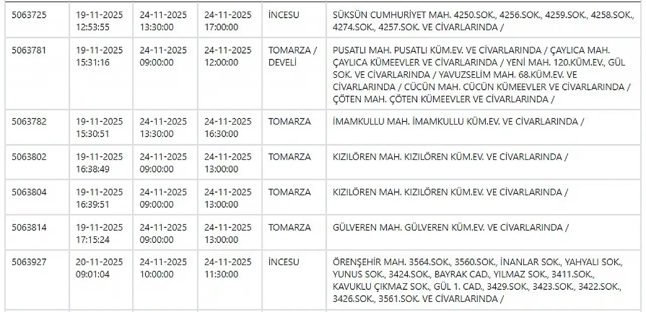KCETAŞ’tan edinilen bilgilere göre yarın (24 Kasım 2025) aşağıdaki mahallelerde elektrik kesintisi yaşanacak.