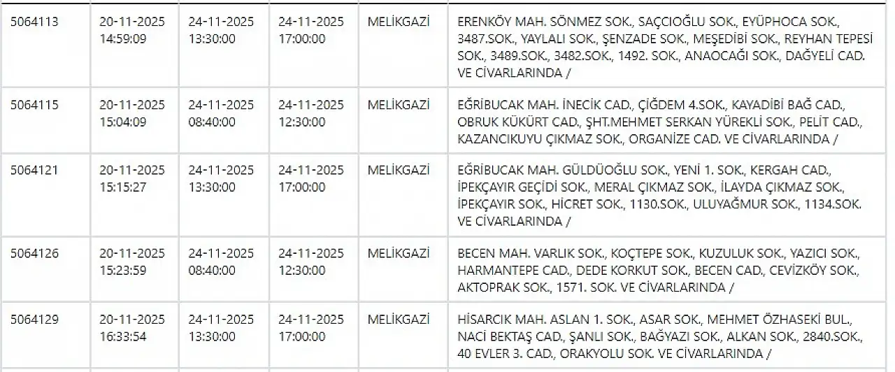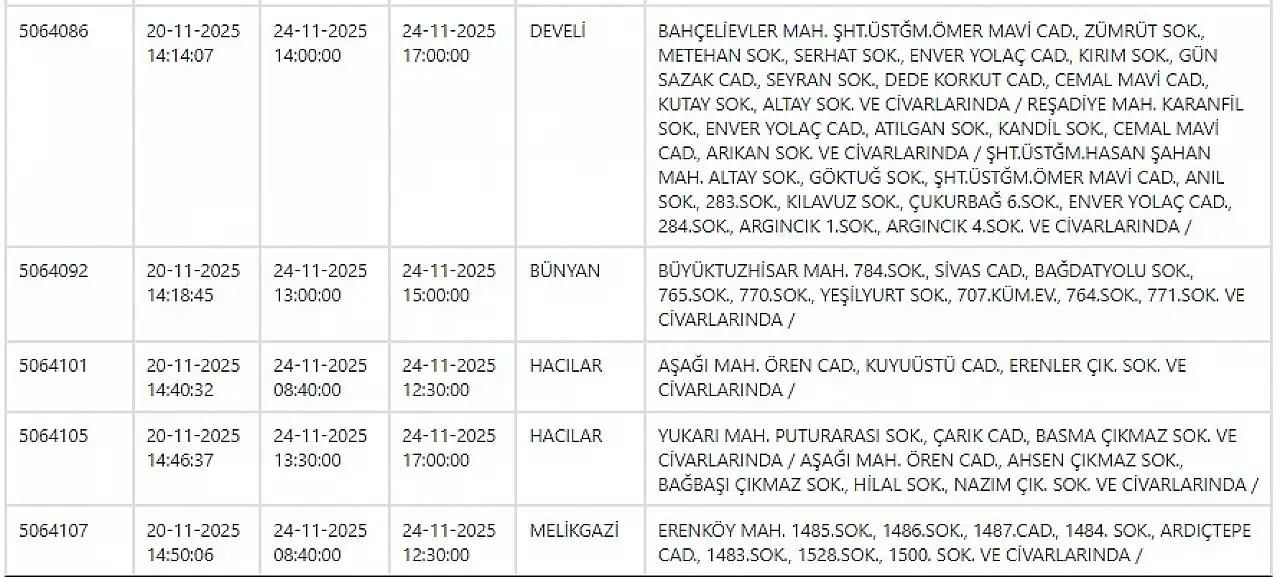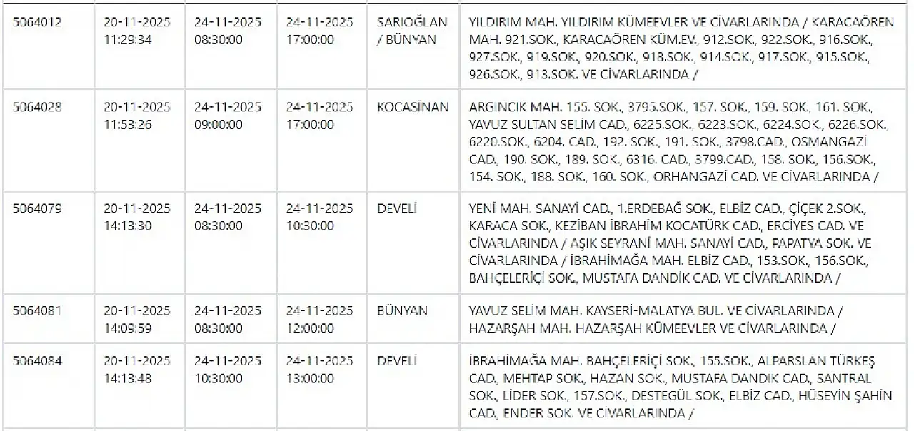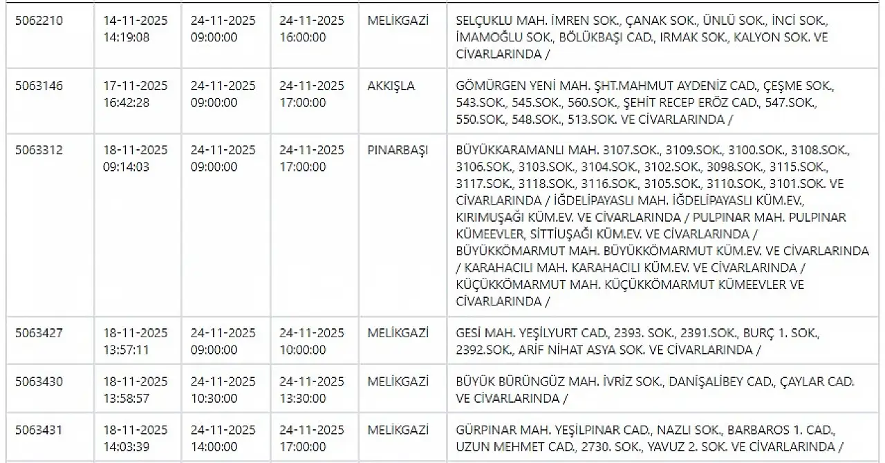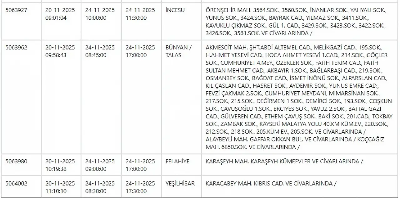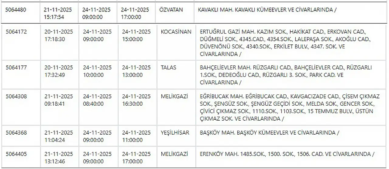 - KCETAŞ paylaştı: Kayseri'de yarın elektrik kesintisi yaşanacak ilçeler! 24 Kasım 2025