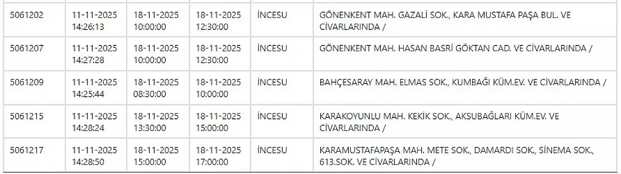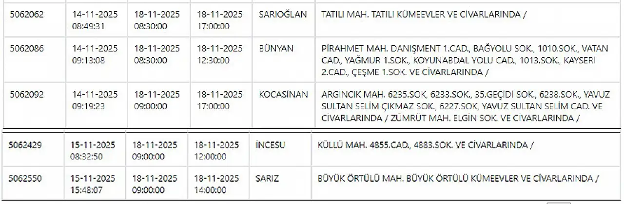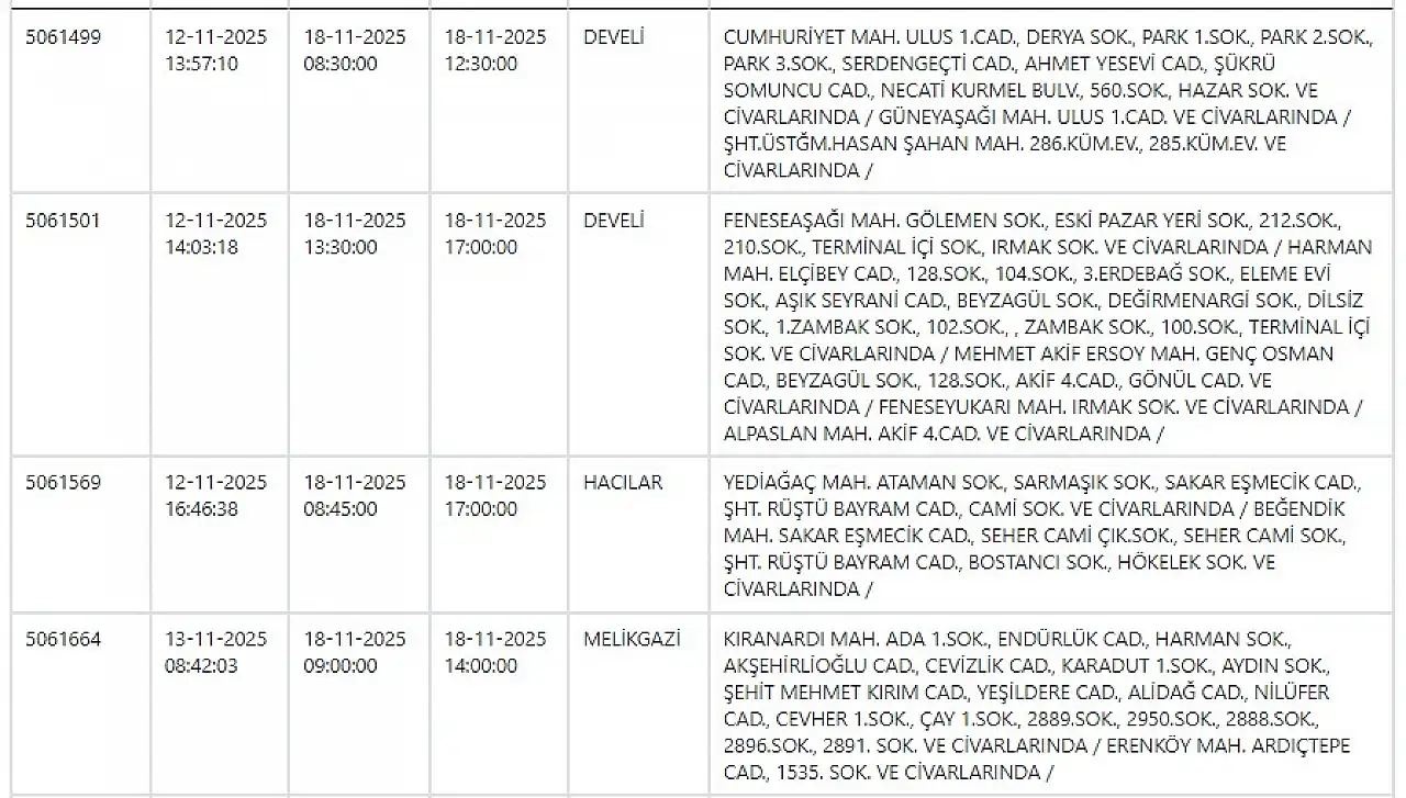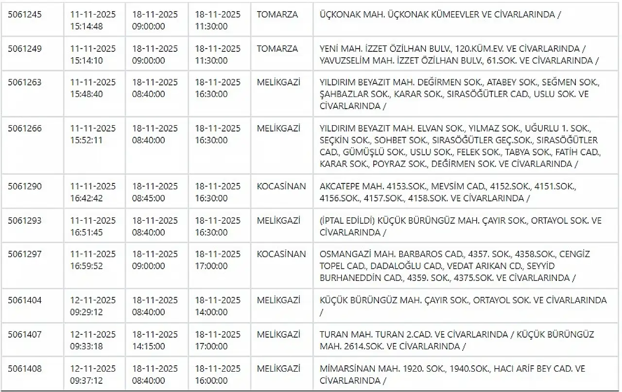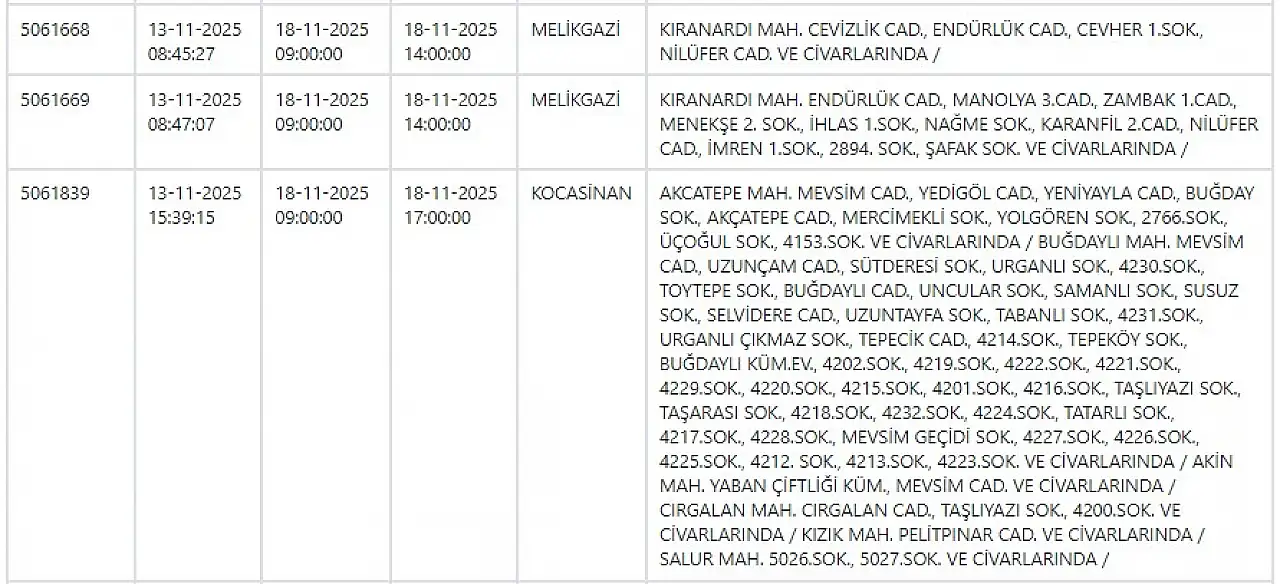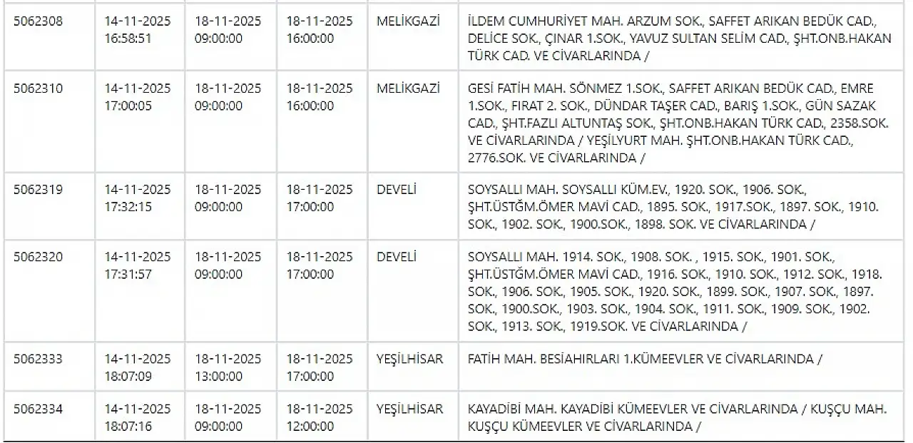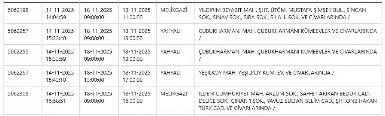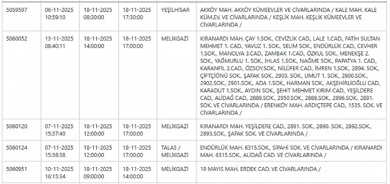 Kayseri'de elektrik kesintisi yaşanacak ilçeler aşağıdaki gibidir,