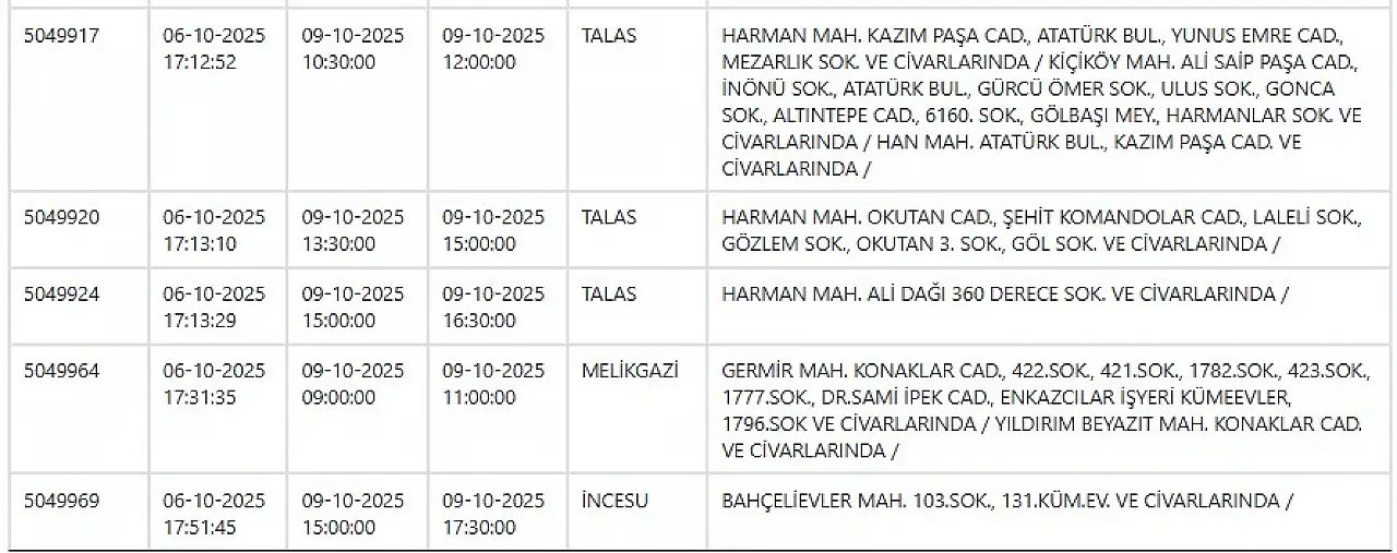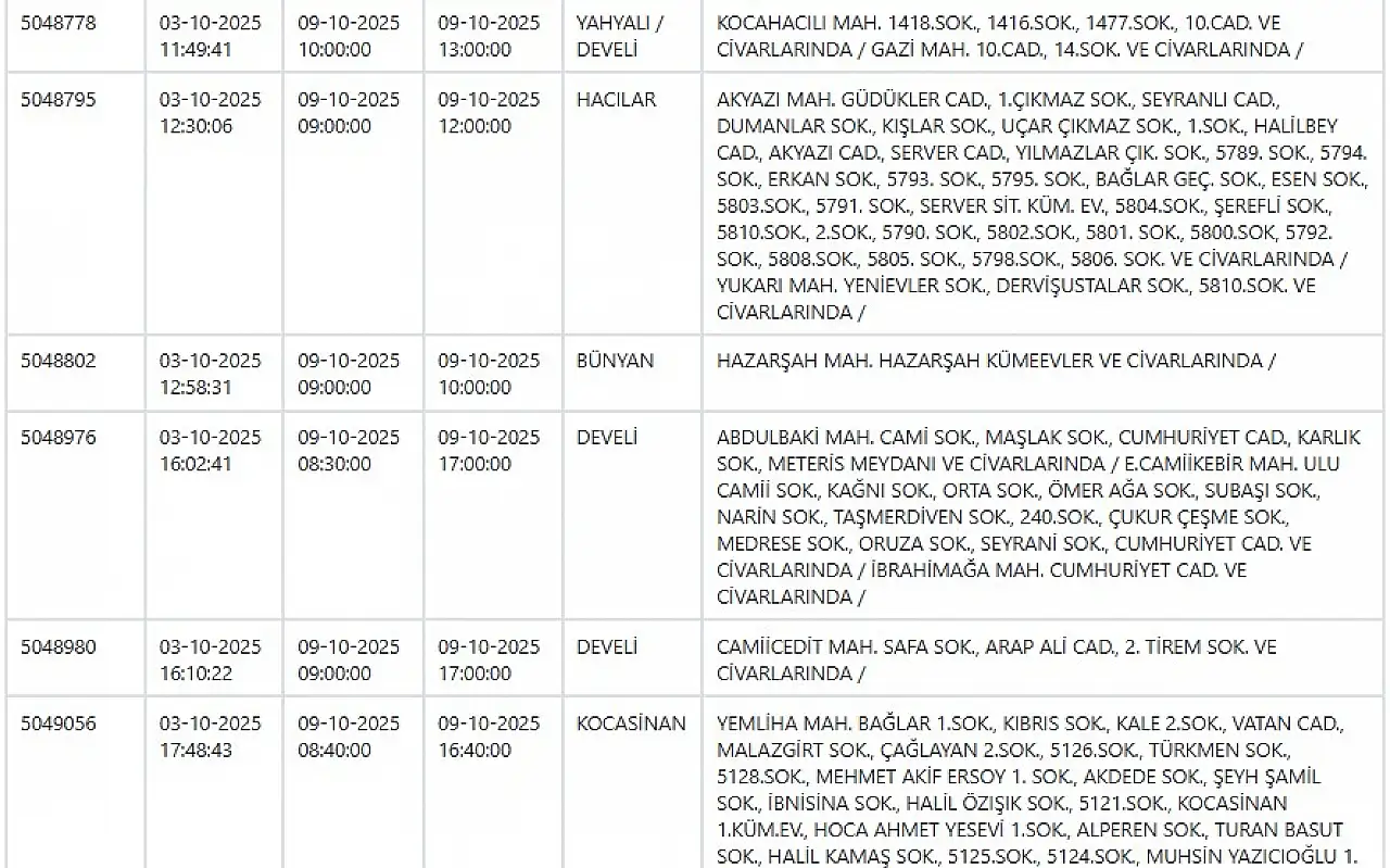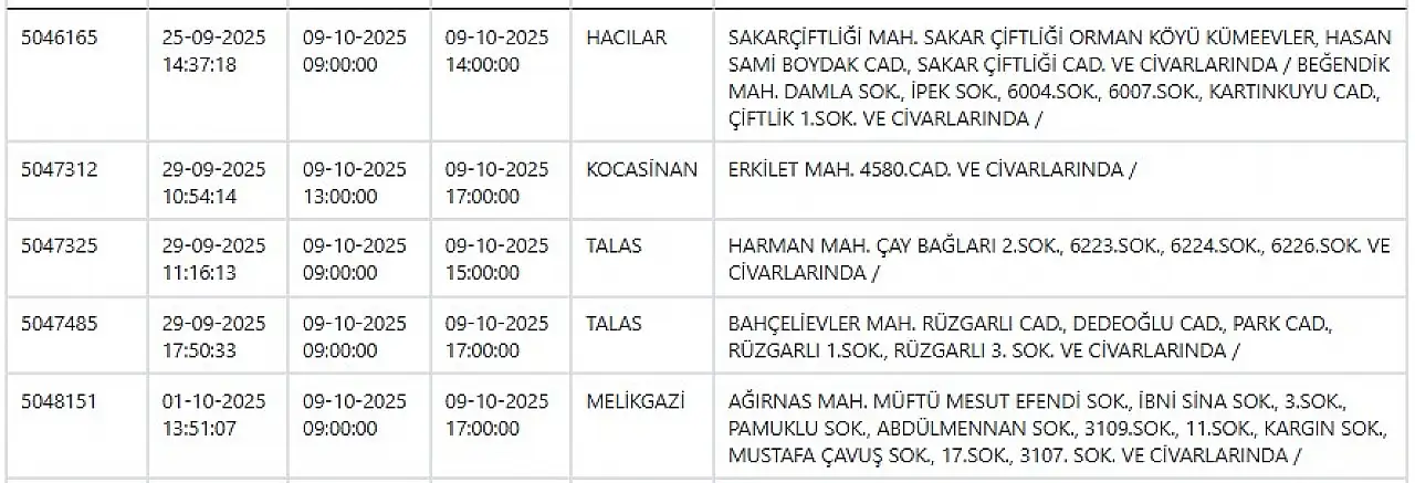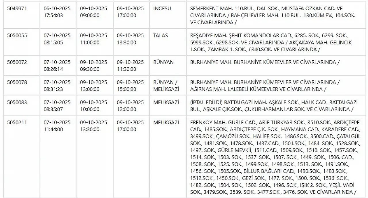 9 Ekim Kayseri’nin çeşitli ilçelerinde elektrik kesintisi yaşanacak ve kesinti gün boyu sürecek. Peki, 9 Ekim Kayseri’nin hangi ilçelerinde elektrik kesintisi yaşanacak? Kayseri’de Talas elektrik kesintisi, Melikgazi elektrik kesintisi, Kocasinan elektrik kesintisi ve Develi elektrik kesintisi araştırılıyor. Peki, Kayseri elektrik kesintisi kaç saat sürecek? Kayseri elektrik ne zaman gelecek? Kayseri elektrik kesintisi ve detaylar!