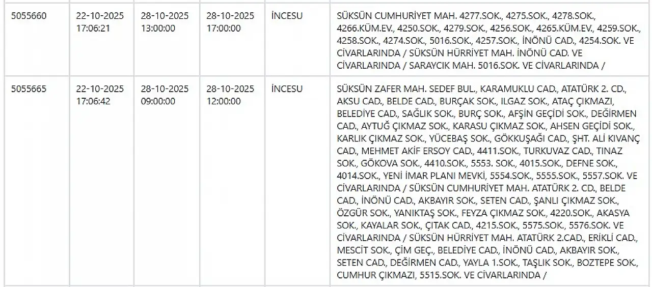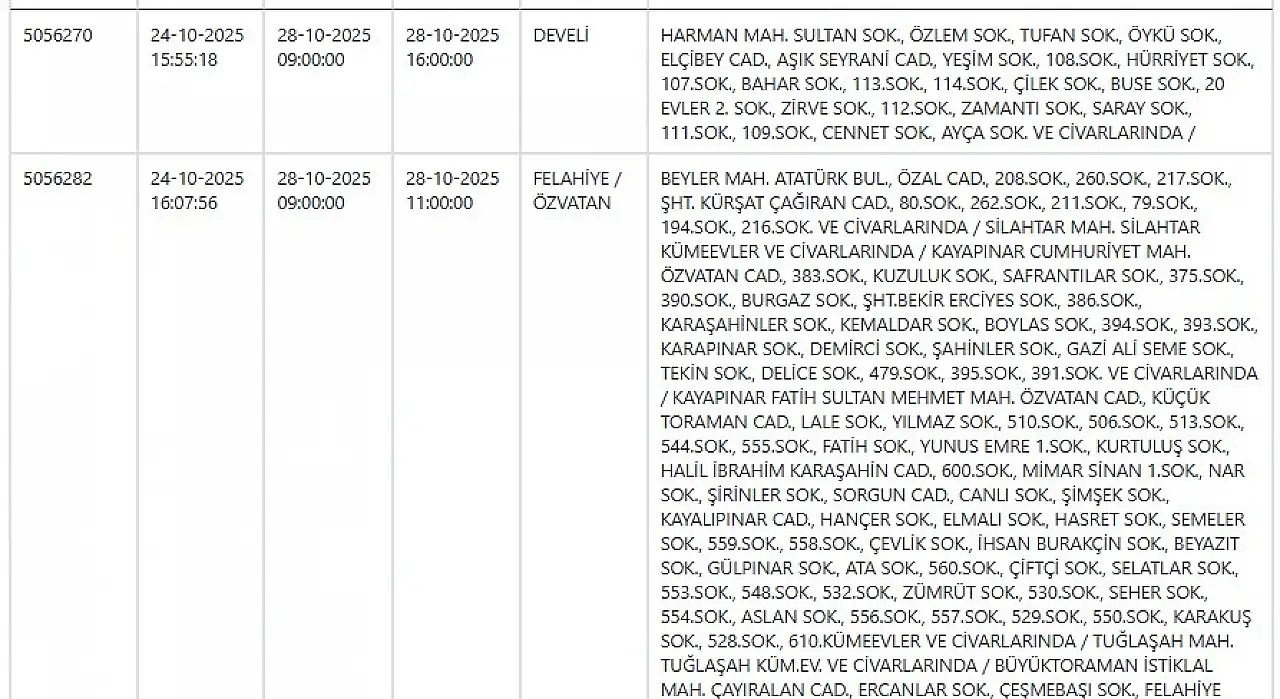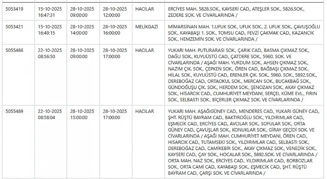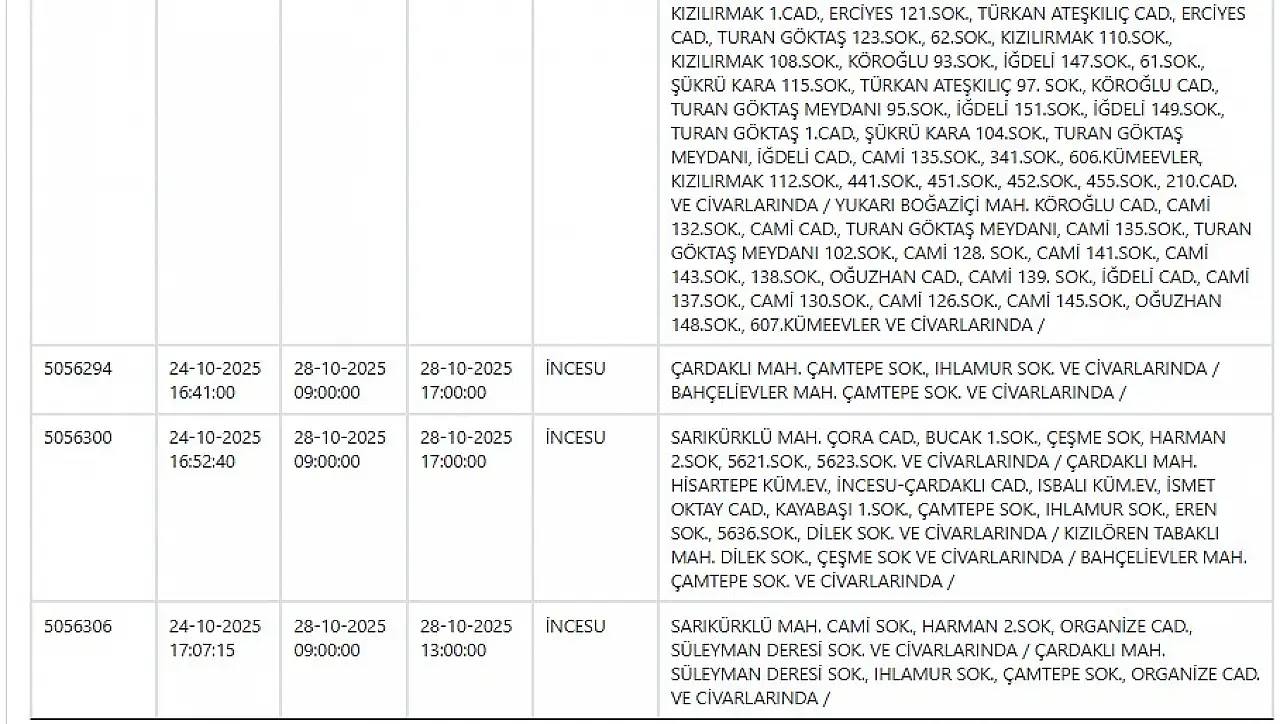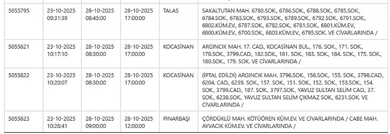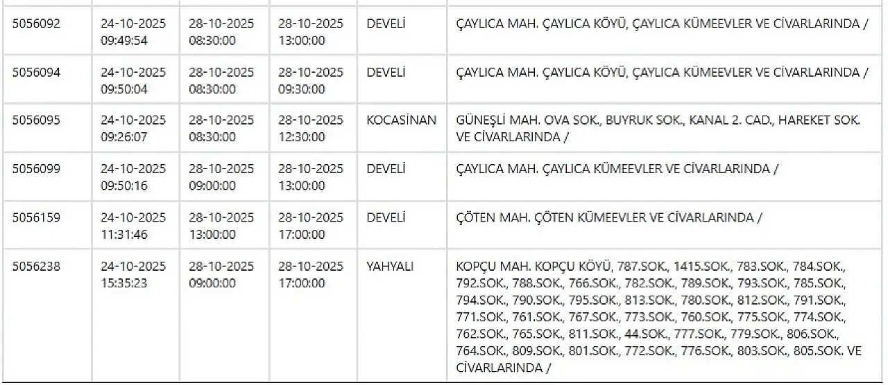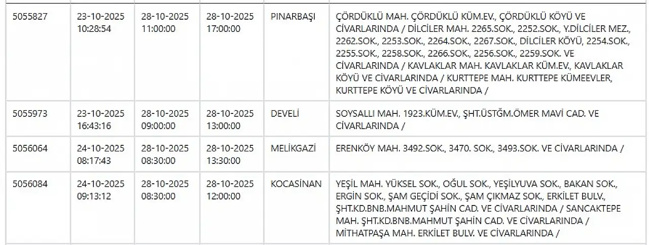 KCETAŞ’tan edinilen bilgilere göre 28 Ekim 2025 tarihinde aşağıdaki mahallelerde elektrik kesintisi yaşanacak.