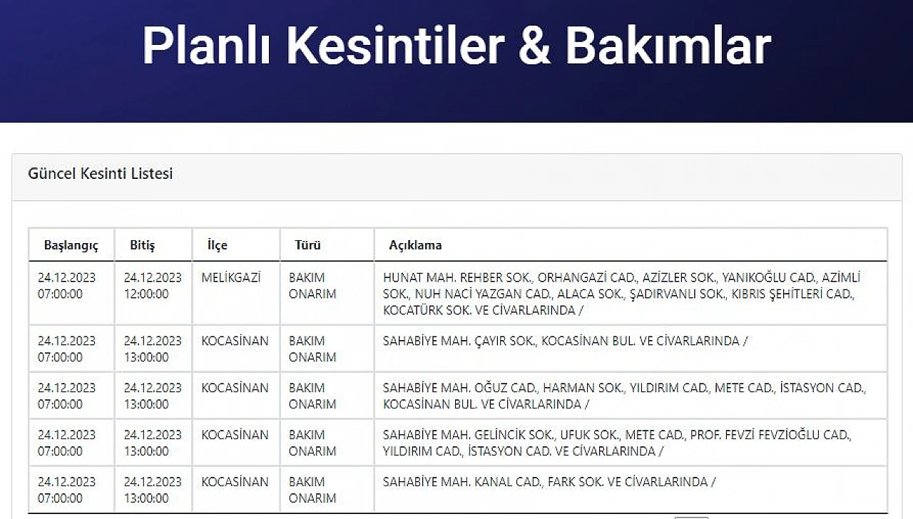 KCETAŞ’tan edinilen bilgilere göre bugün (24 Aralık 2023) aşağıdaki mahallelerde elektrik kesintisi yaşanacak.