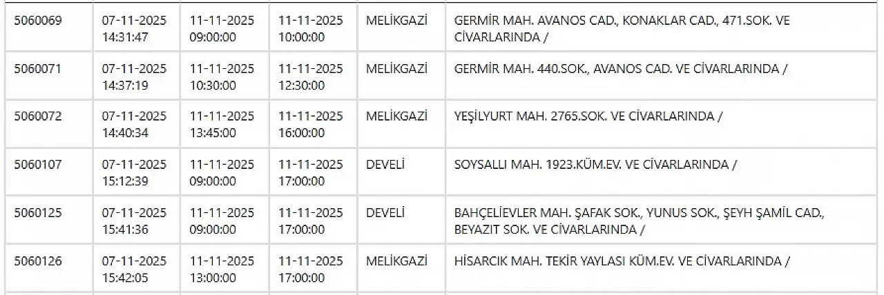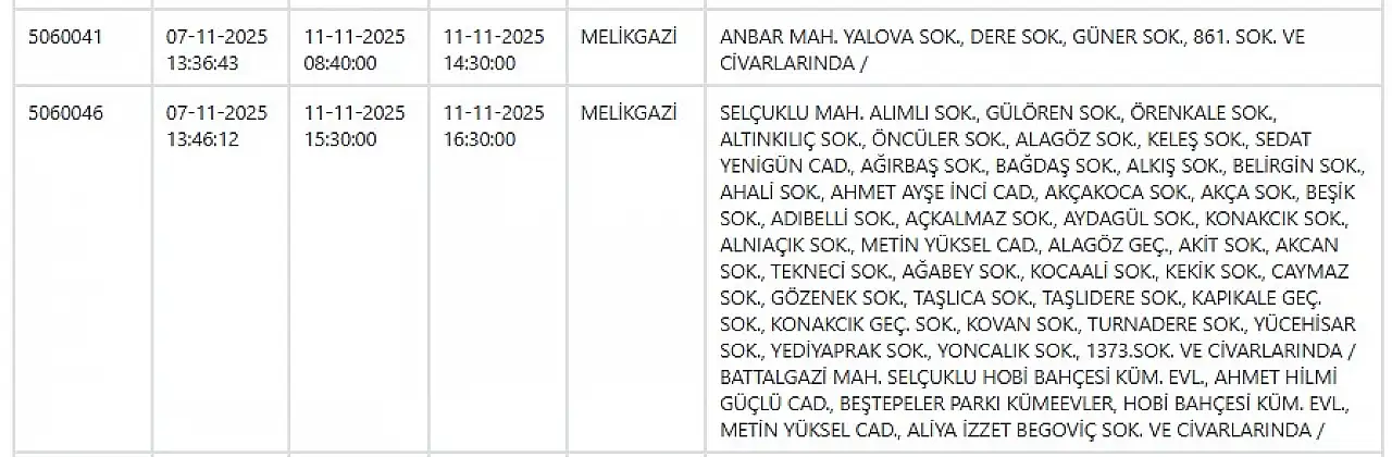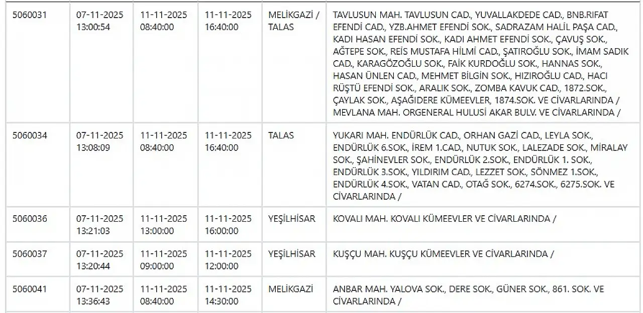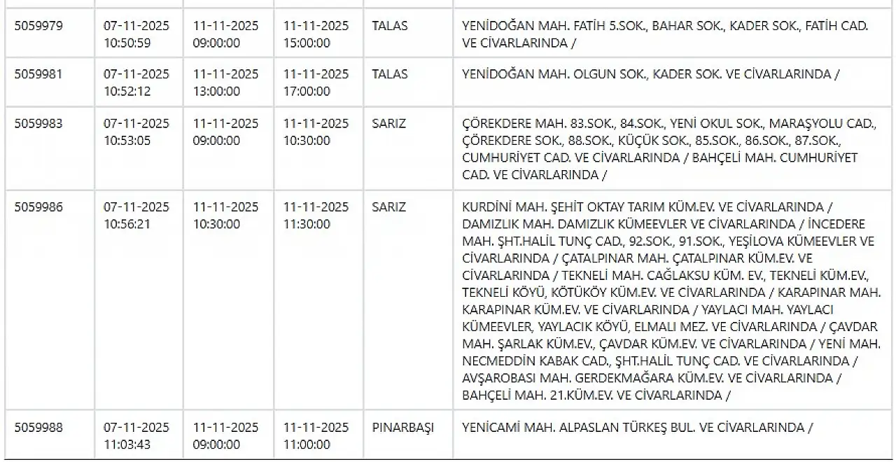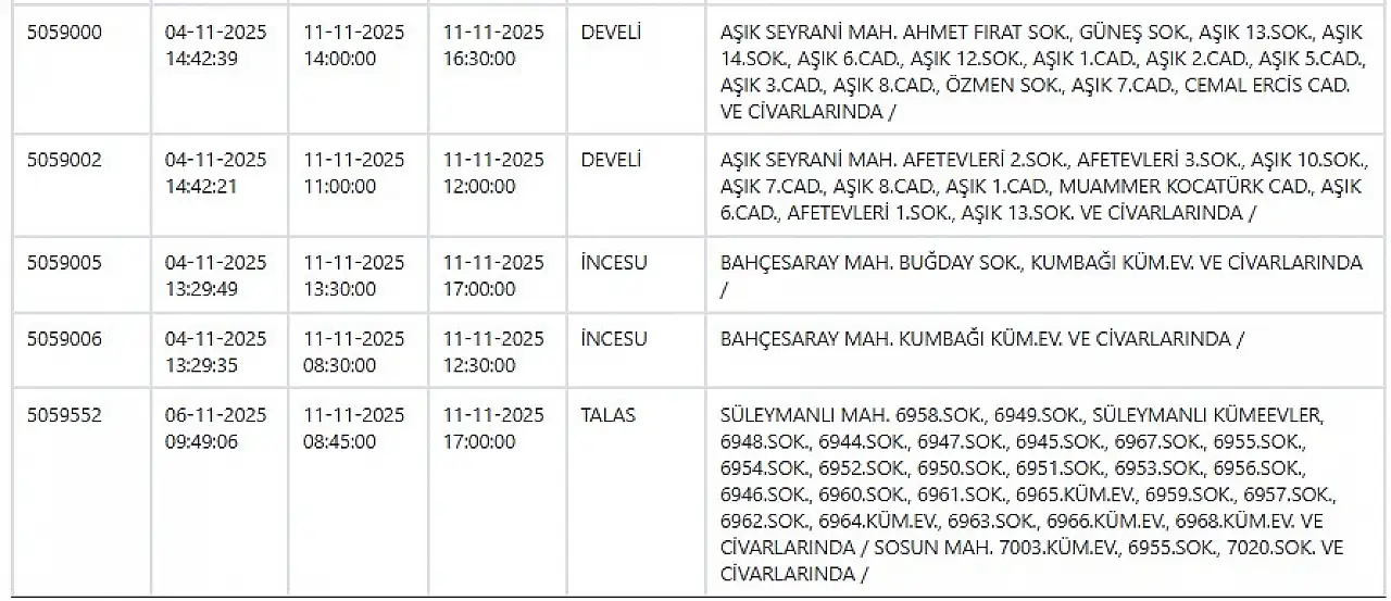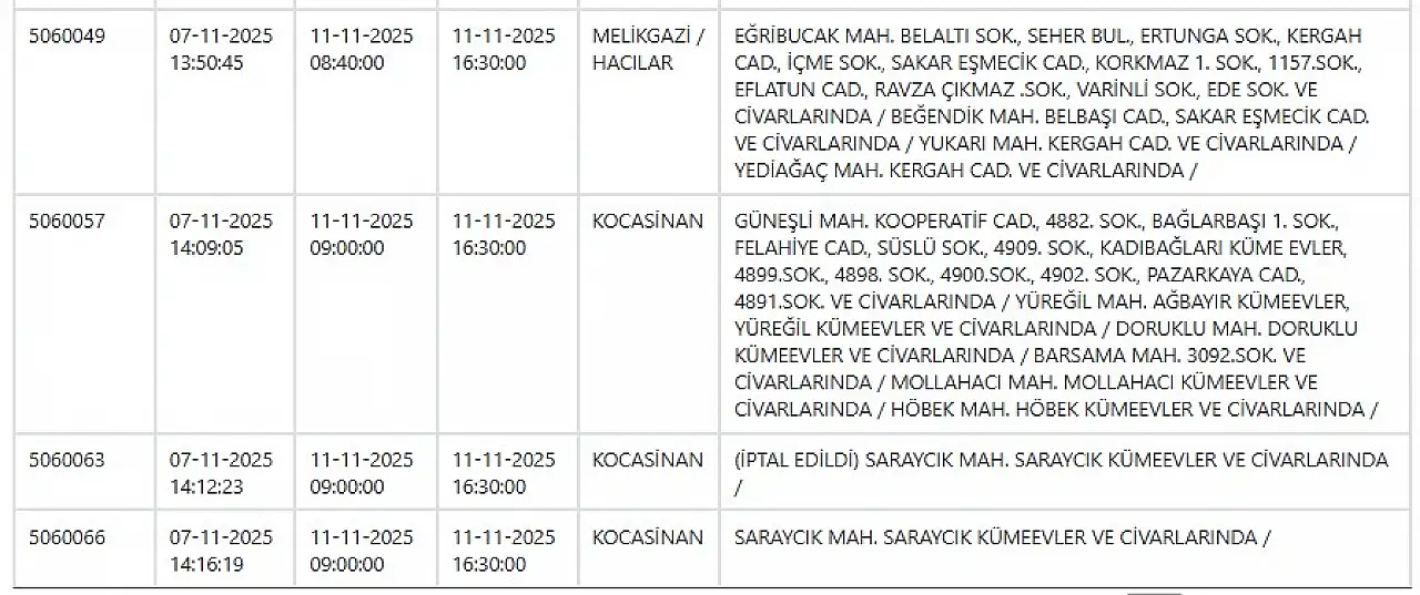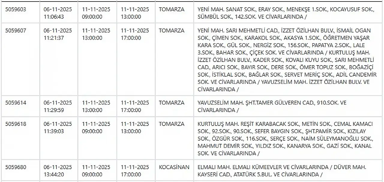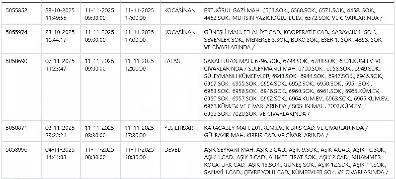 KCETAŞ’tan edinilen bilgilere göre yarın (11 Kasım 2025) aşağıdaki mahallelerde elektrik kesintisi yaşanacak.