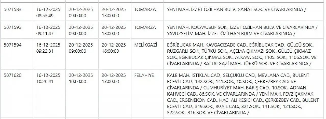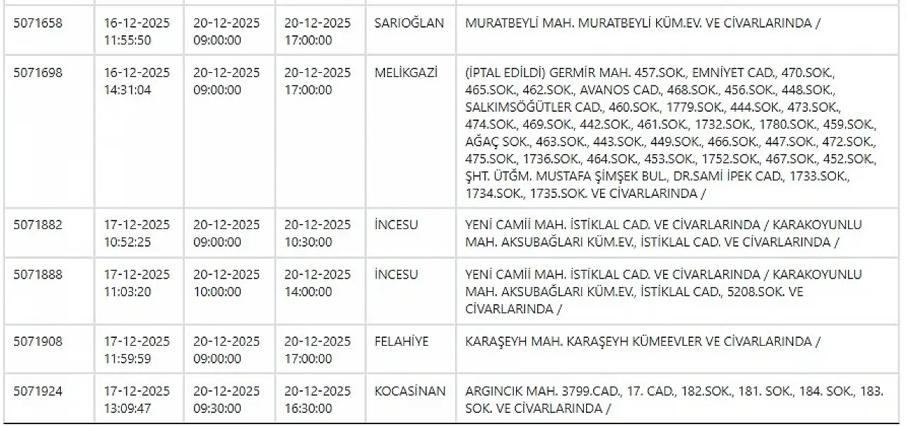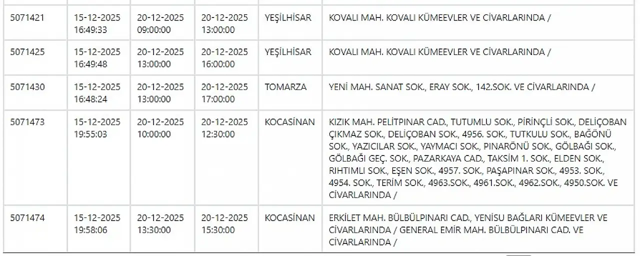KCETAŞ’tan edinilen bilgilere göre yarın (20 Aralık 2025) aşağıdaki mahallelerde elektrik kesintisi yaşanacak.