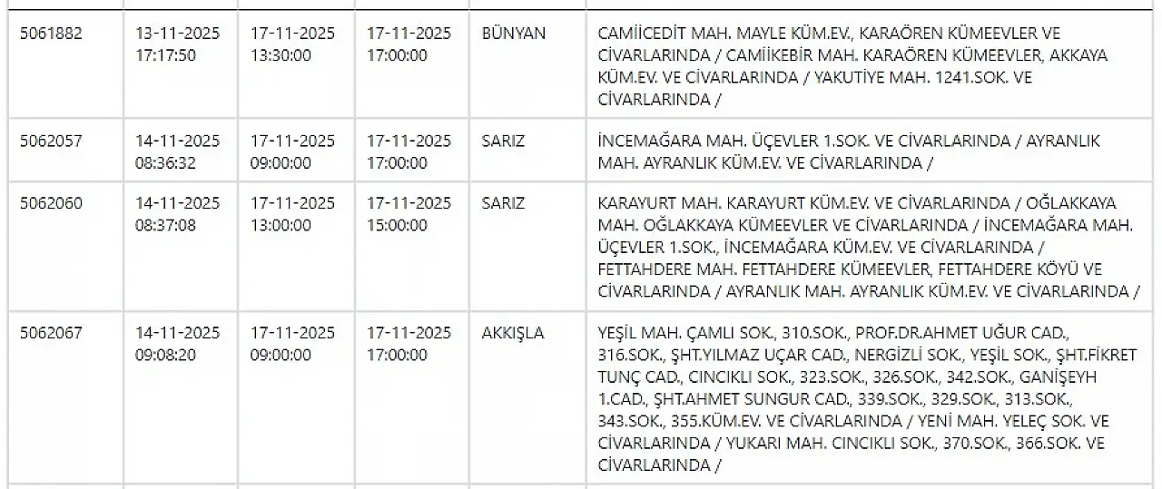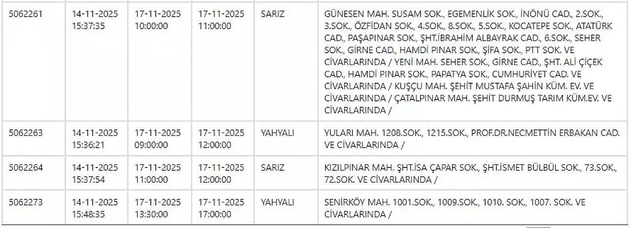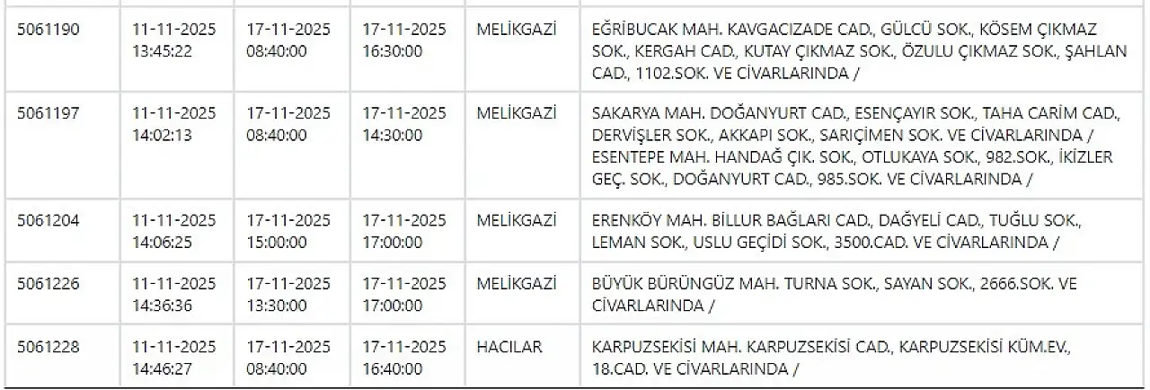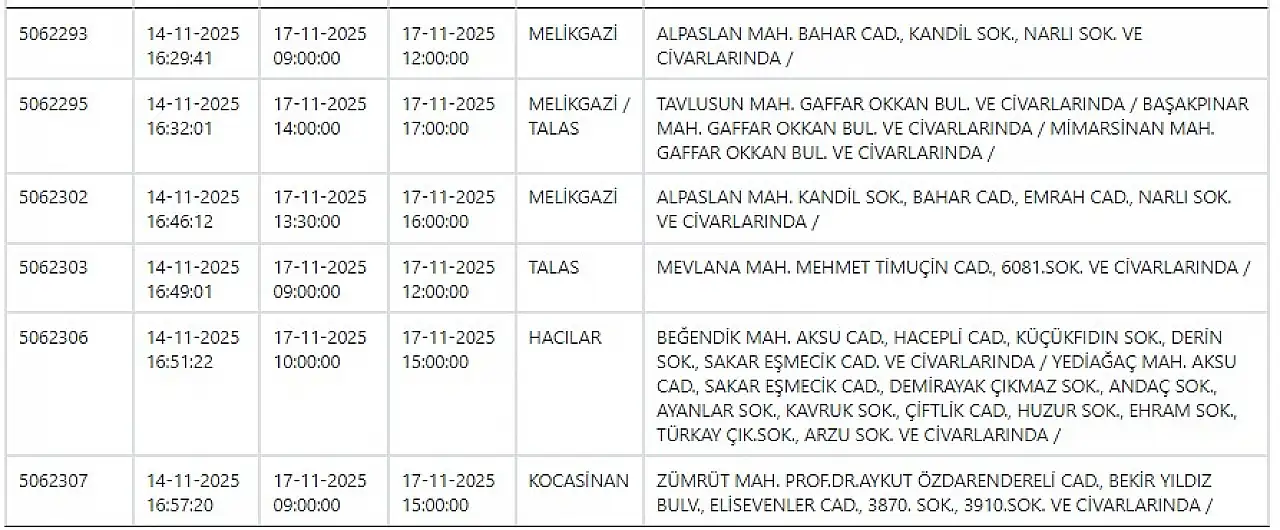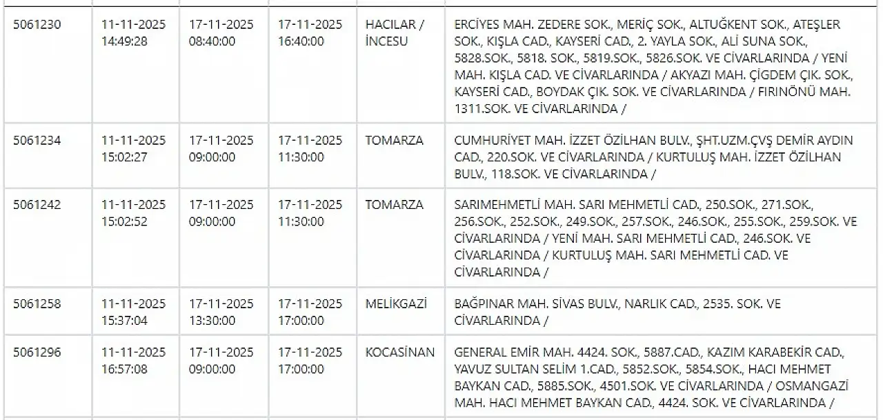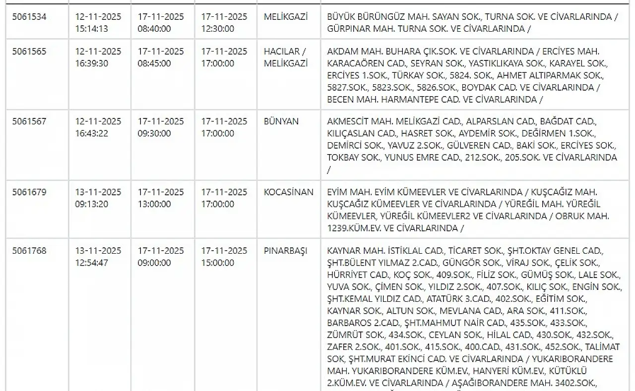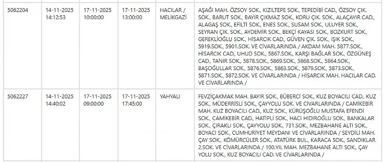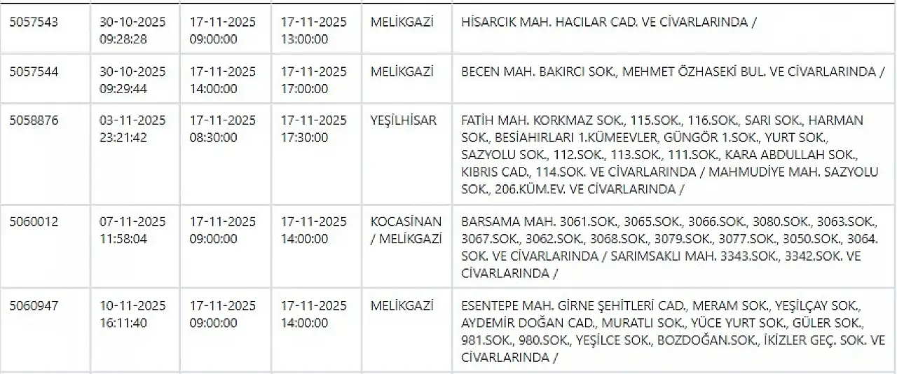 - KCETAŞ uyardı - Kayseri haftanın ilk gününe elektrik kesintisiyle başlayacak! 17 Kasım 2025