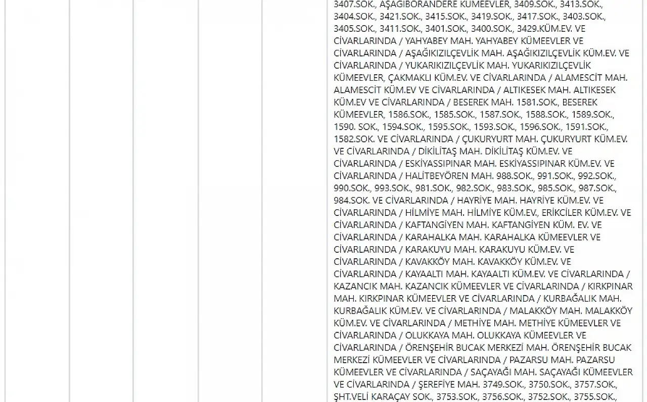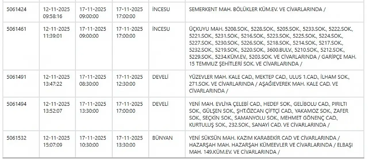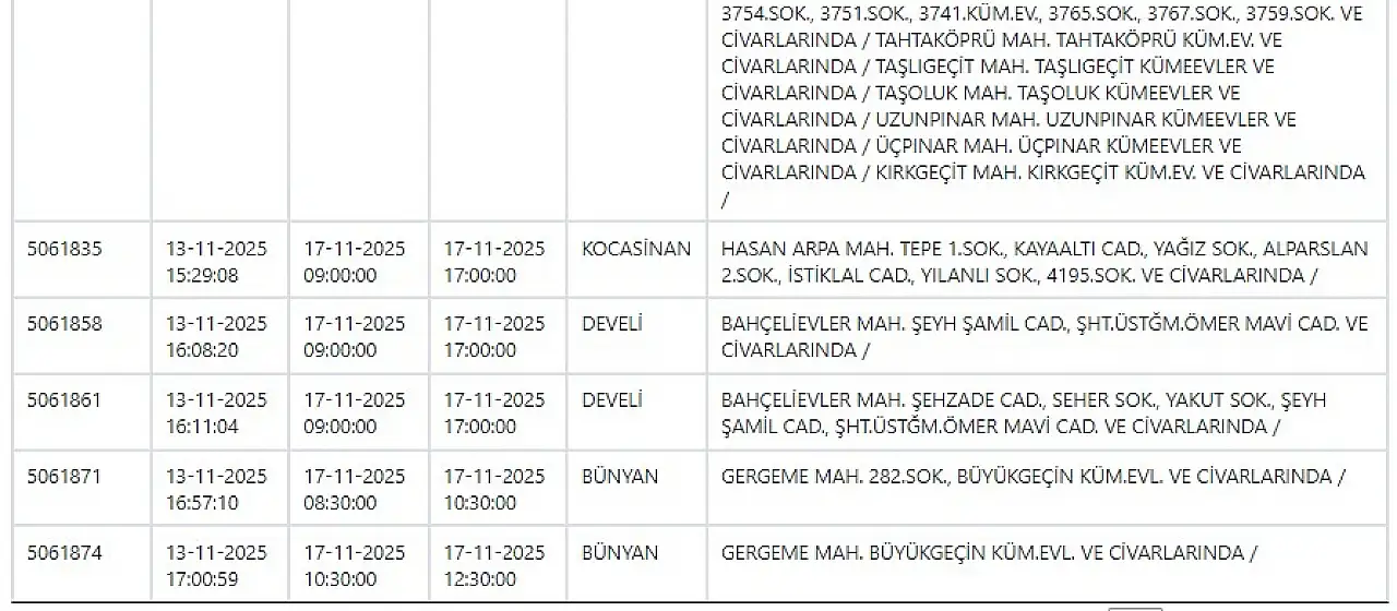 KCETAŞ’tan edinilen bilgilere göre yarın (17 Kasım 2025) aşağıdaki ilçe ve mahallelerde elektrik kesintisi yaşanacak.