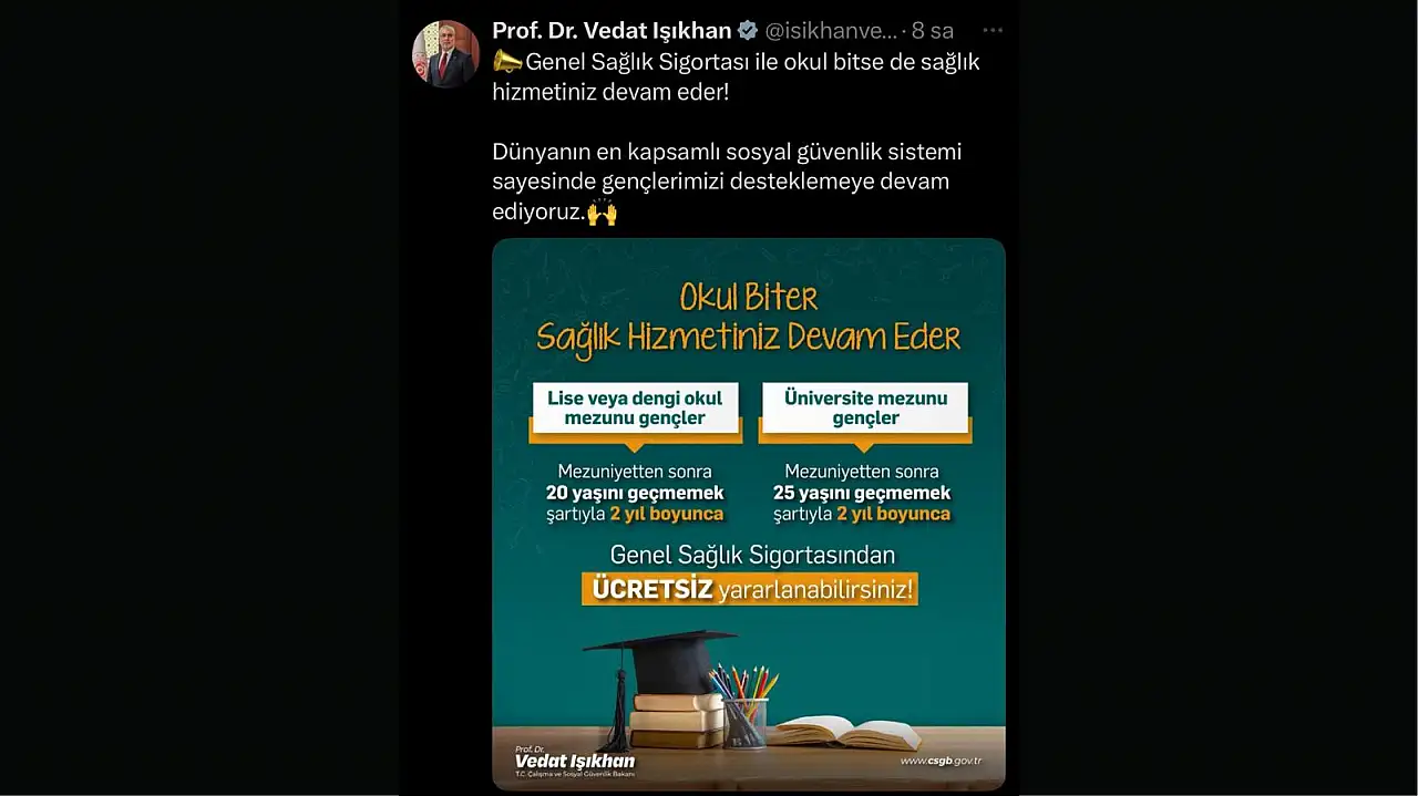 T.C. Çalışma ve Sosyal Güvenlik Bakanı Prof. Dr. Vedat Işıkhan, sosyal medya üzerinden yaptığı açıklamayla mezun gençlere yönelik Genel Sağlık Sigortası (GSS) müjdesini duyurdu. Işıkhan, ‘Genel Sağlık Sigortası ile okul bitse de sağlık hizmetiniz devam eder!’ ifadelerini kullanarak gençlerin sağlık hizmetlerinden kesintisiz yararlanabileceğini vurguladı.
