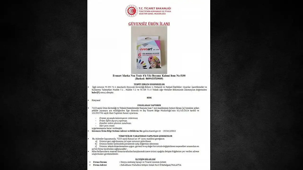 Ticaret Bakanlığı, tüketicileri yakından ilgilendiren önemli bir uyarıda bulundu. Yapılan denetimlerde 'Evenart Marka Non Toxic 6'lı Yüz Boyama Kalemi' (Ürün Kodu: 5190, Barkod: 8699433519009) güvensiz ürün kategorisine alındığı belirtildi. Detaylar Kayseri Anadolu Haber'de…