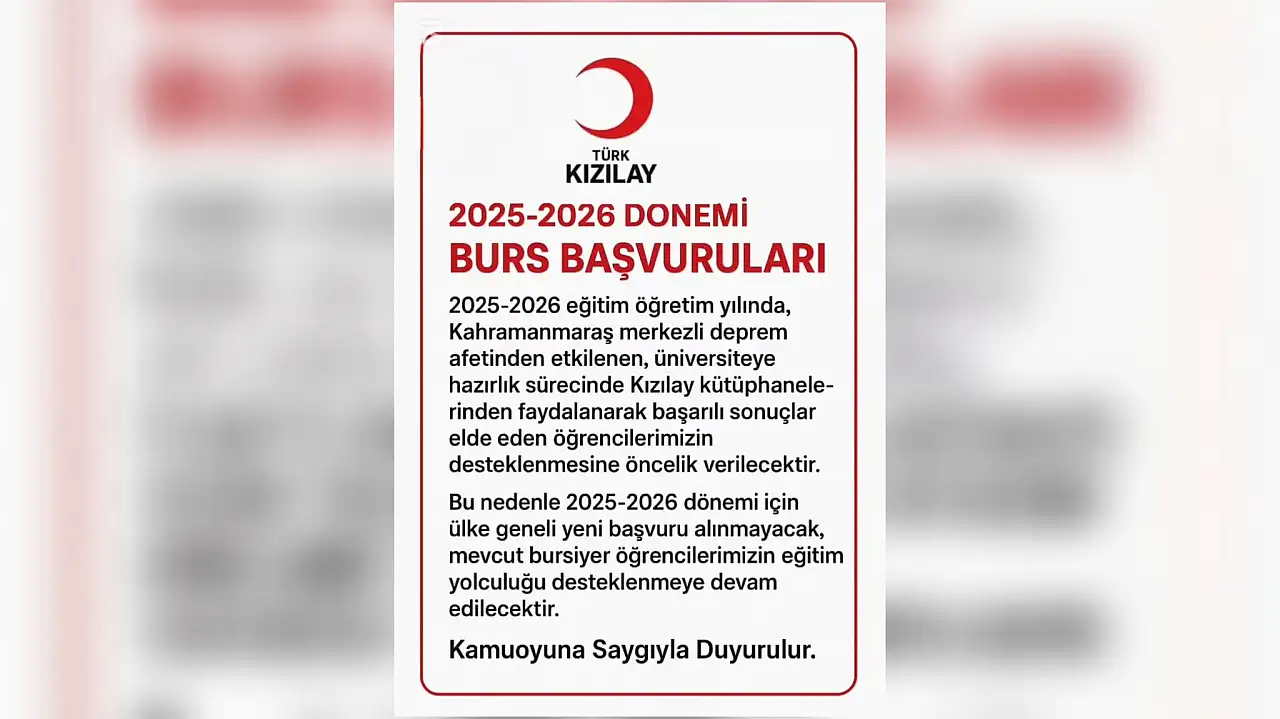 Kızılay’dan yapılana açıklamaya göre, 2025-2026 eğitim öğretim yılı için yeni burs başvurusu alınmayacak. Ancak mevcut bursiyerler ile depremzede öğrencilerin desteklenmesi devam edecek. Kızılay, özellikle Kahramanmaraş merkezli depremlerden etkilenen gençlere öncelik tanınacağının altını çizdi.