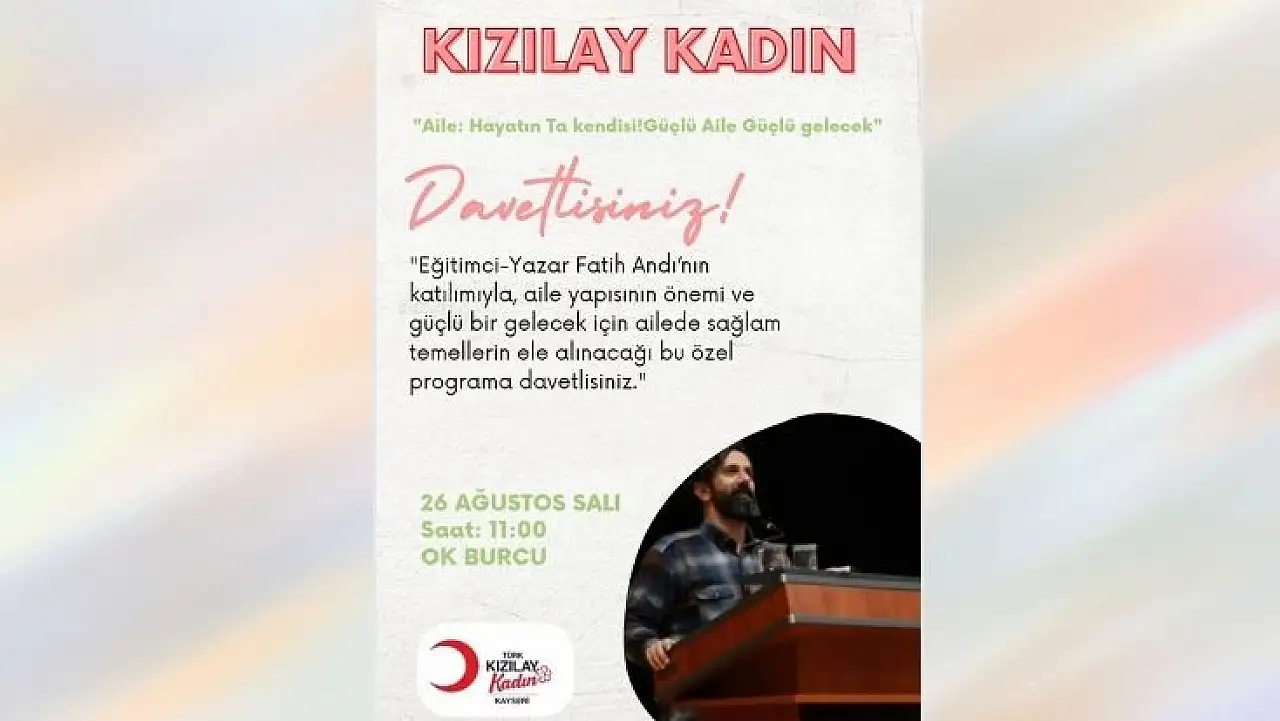 Türk Kızılay Kadın Kayseri, 26 Ağustos'ta OK Burcu'da büyük bir etkinliğe hazırlanıyor. Eğitimci-yazar Fatih Andı'nın konuşmacı olacağı programda, 'Aile: Hayatın Ta Kendisi! Güçlü Aile Güçlü Gelecek' temasıyla aile yapısının önemi masaya yatırılacak. Detaylar haberimizde...