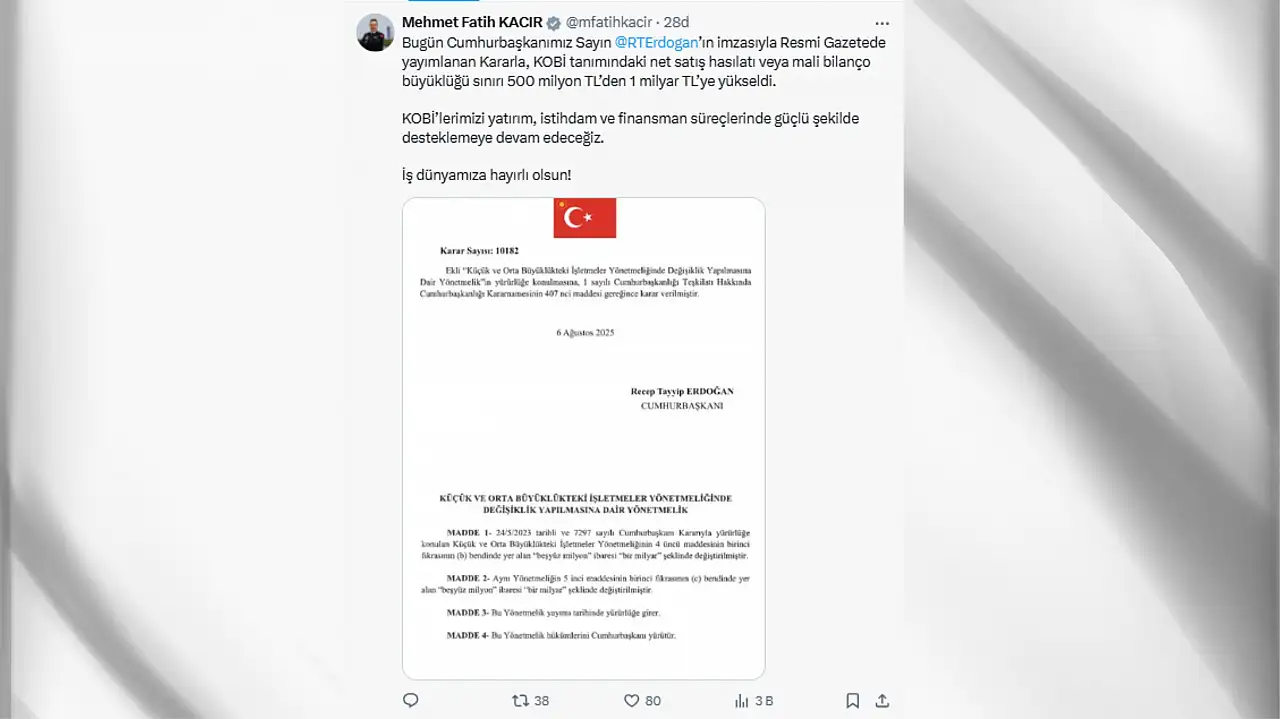 Sosyal medya hesabı üzerinden alınan kararı duyurulan Teknoloji ve Sanayi Bakanı Mehmet Fatih Kacır, ‘’ Bugün Cumhurbaşkanımız Sayın Recep Tayyip Erdoğan ’ın imzasıyla Resmi Gazetede yayımlanan Kararla, KOBİ tanımındaki net satış hasılatı veya mali bilanço büyüklüğü sınırı 500 milyon TL’den 1 milyar TL’ye yükseldi. KOBİ’lerimizi yatırım, istihdam ve finansman süreçlerinde güçlü şekilde desteklemeye devam edeceğiz. İş dünyamıza hayırlı olsun!'' ifadelerine yer verdi.