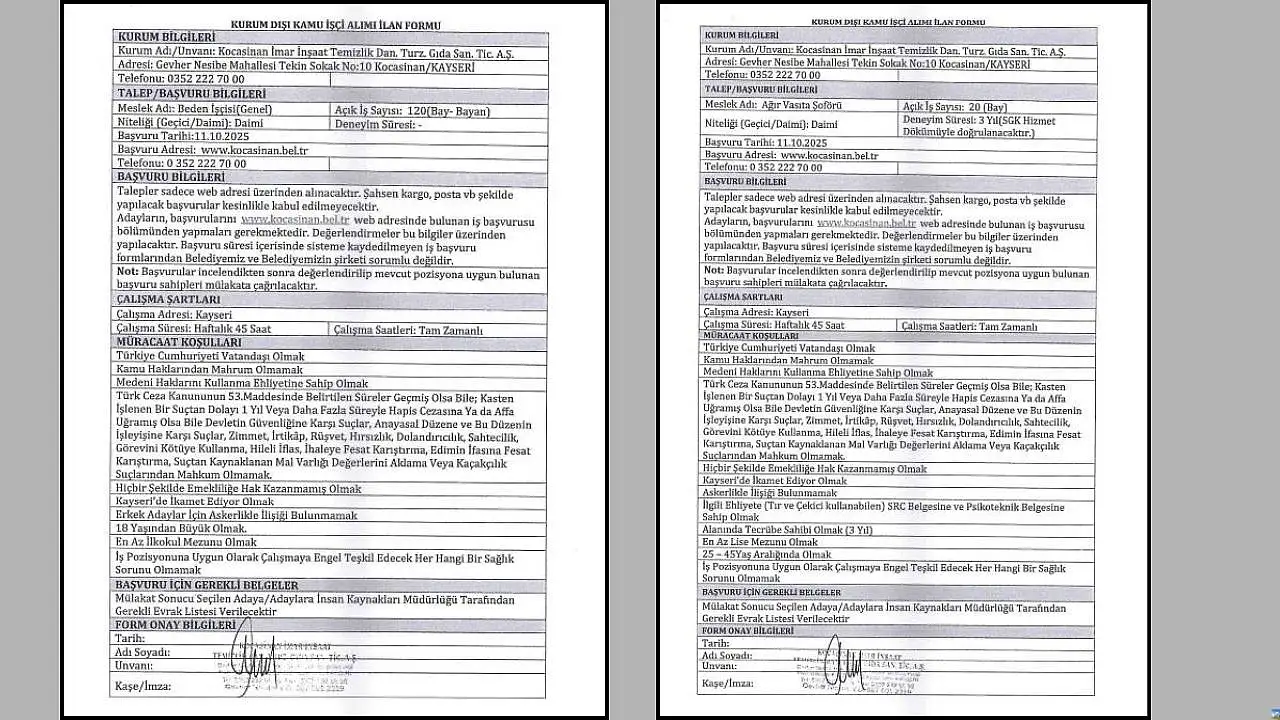 Her iki ilan için de çalışma adresi Kayseri olarak belirtilirken, personeller haftalık 45 saat çalışma süresine tabi olacak.