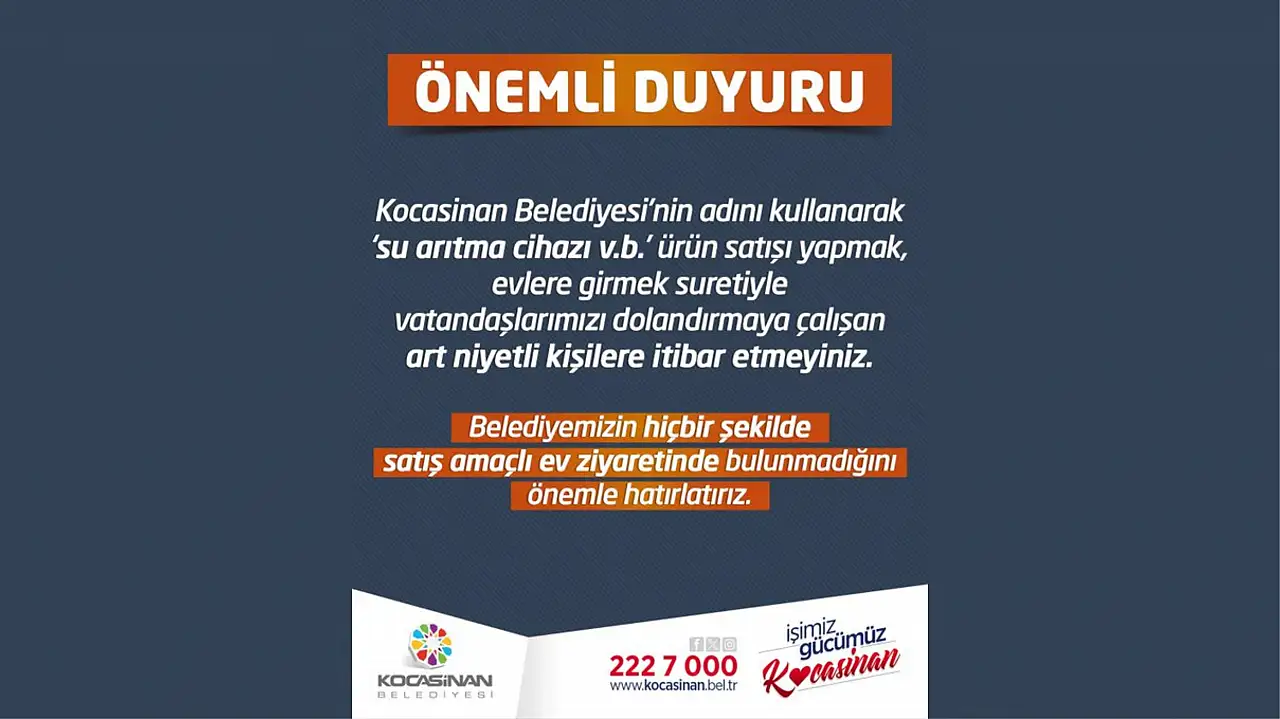 Kocasinan Belediyesi adını kullanan dolandırıcılar vatandaşların evlerine zorla girerek su arıtma cihazı ve benzeri cihazların satışını gerçekleştirmeye çalıştıkları belirtildi. Belediye tarafında herhangi bir satış amaçlı ev ziyareti gerçekleştirilmediği belirtilen açıklamada bu tarz olaylarla karşılaşıldığında itimat edilmemesi ve kolluk kuvvetlerine bilgi verilmesi gerektiği belirtildi.