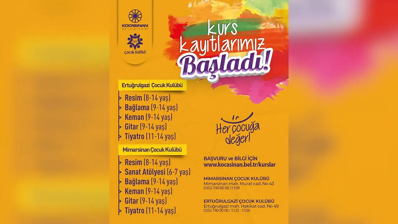 Ertuğrulgazi ve Mimarsinan Çocuk Kulüplerinde düzenlenecek kurslar, farklı yaş gruplarına hitap eden geniş bir yelpazede hazırlanarak çocuklara hem eğlenceli hem de öğretici bir eğitim ortamı sunuyor.