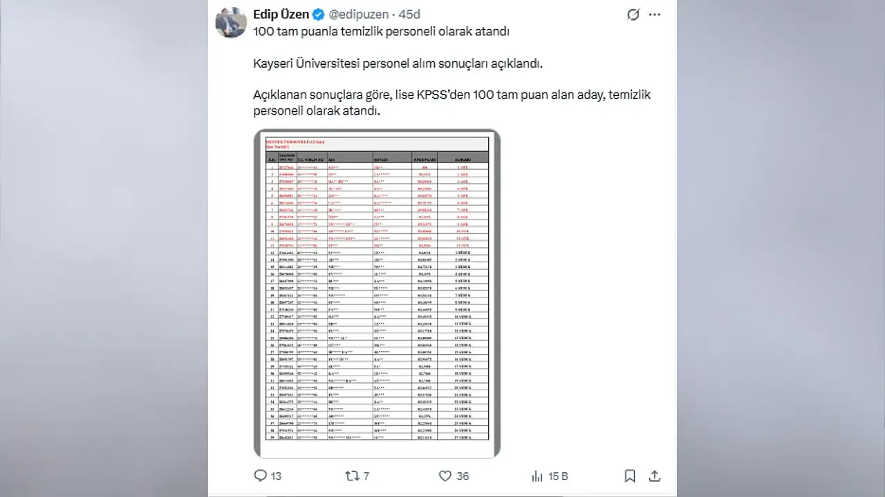 Memurlar.net Genel Yayın Yönetmeni ve Gazeteci Edip Üzen'in sosyal medya hesabı üzerinden yaptığı paylaşıma göre 2024 KPSS Ortaöğretim Sınavı'ndan tam puan alarak Türkiye birincisi olan bir vatandaş üniversitenin destek personeli /temizlik personeli kadrosuna tam puanla atandı.