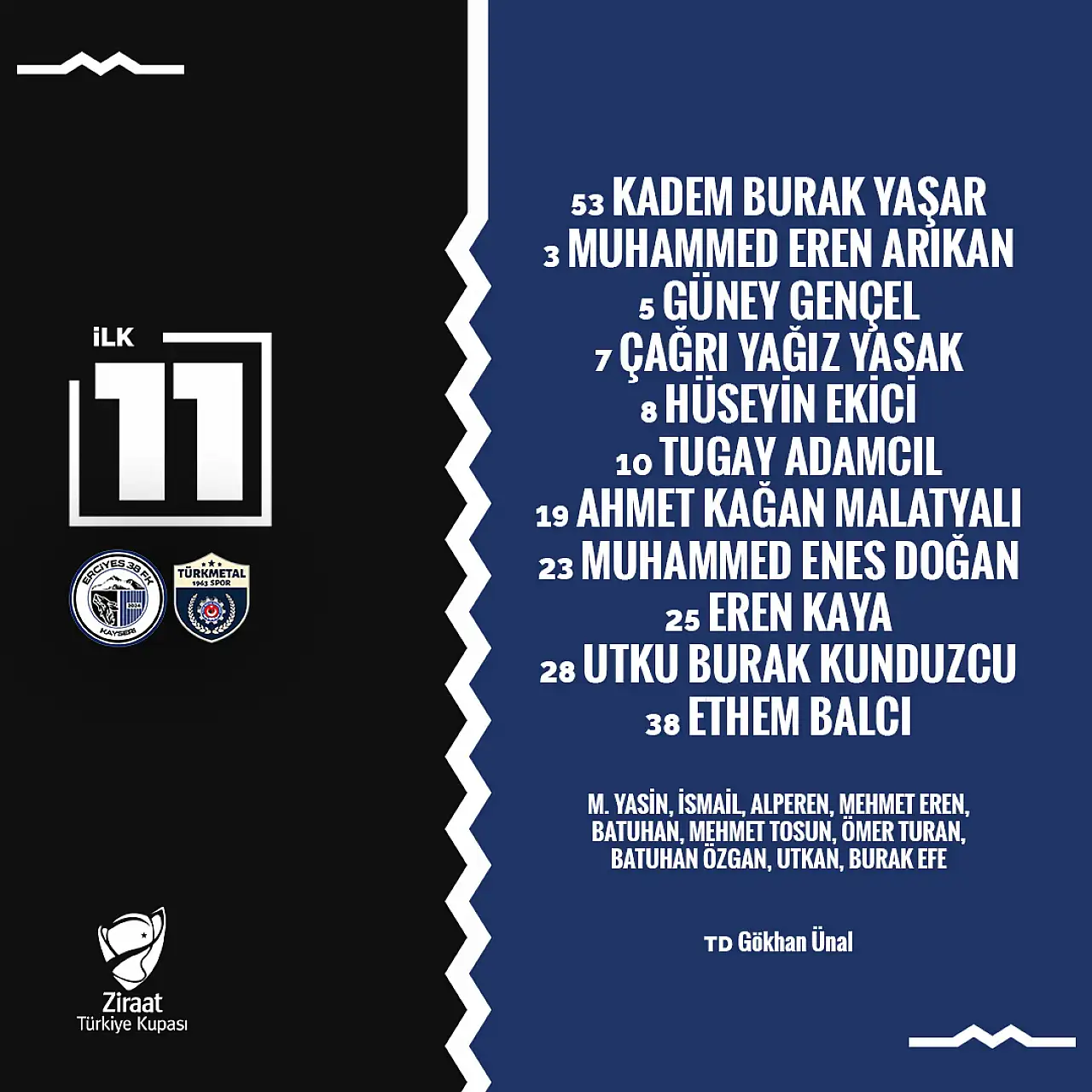 Erciyes 38 FK’nın genç teknik direktörü Gökhan Ünal’ın 11’i belli oldu. Türkiye Kupası maçında Türk Metal 1963 Spor’a karşı sahaya Kadem Burak Yaşar, Muhammed Eren Arıkan, Güney Gençel, Çağrı Yağız Yasak, Hüseyin Ekici, Tugay Adamcıl, Ahmet Kağan Malatyalı, Muhammed Enes Doğan, Eren Kaya, Utku Burak Kunduzcu ve Ethem Balcı’yı süren Ünal, bu kez değişikliğe gitti.