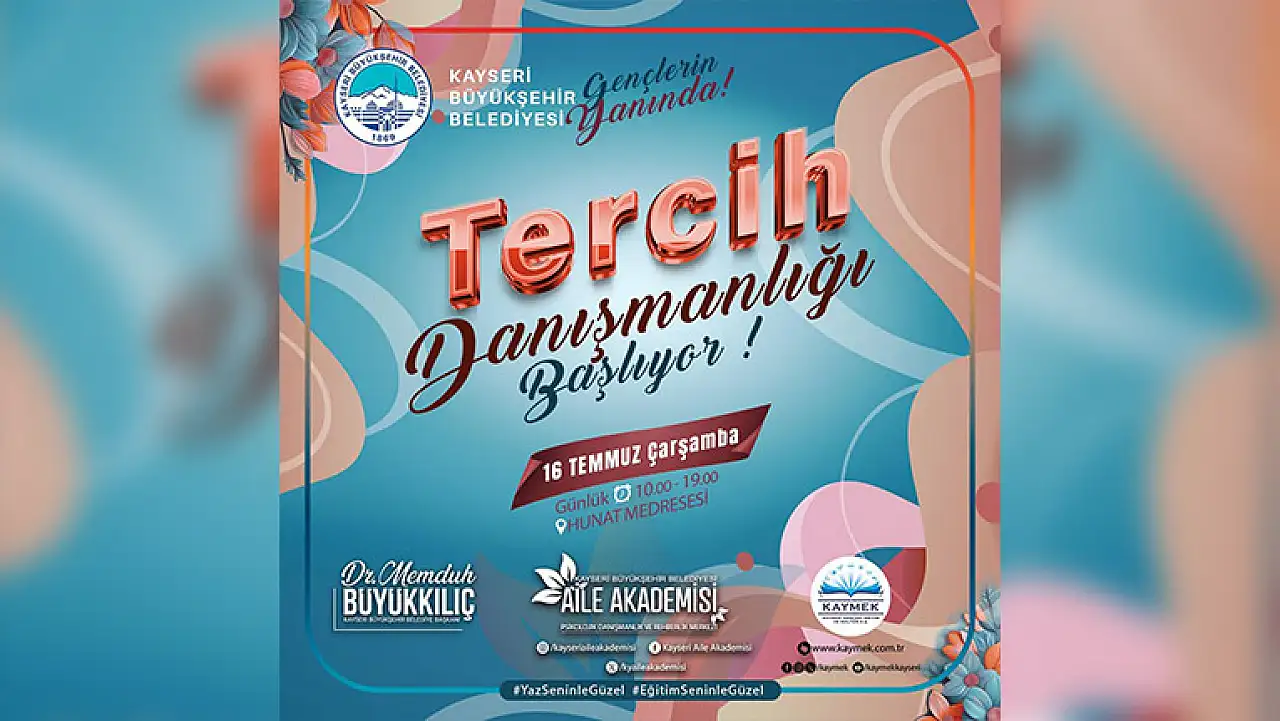 Kayseri Büyükşehir Belediyesi Aile Akademisi Psikolojik Danışmanlık ve Rehberlik Merkezi, LGS (Liselere Geçiş Sistemi) tercih süreci boyunca Hunat Hatun Medresesi’nde gençlere destek vereceği ücretsiz danışmanlık hizmetini 16 Temmuz Çarşamba günü başlatıyor.