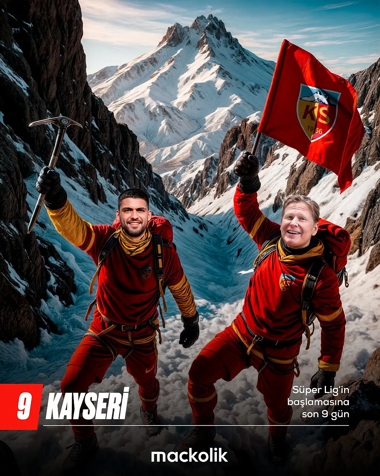 Kayserispor’un başarılı kalecisi Bilal Bayazıt ile teknik direktör Markus Gisdol, Erciyes Dağı’nın zirvesinde görselleştirilen özel bir tasarımla Maçkolik’in paylaşımında yer aldı.
