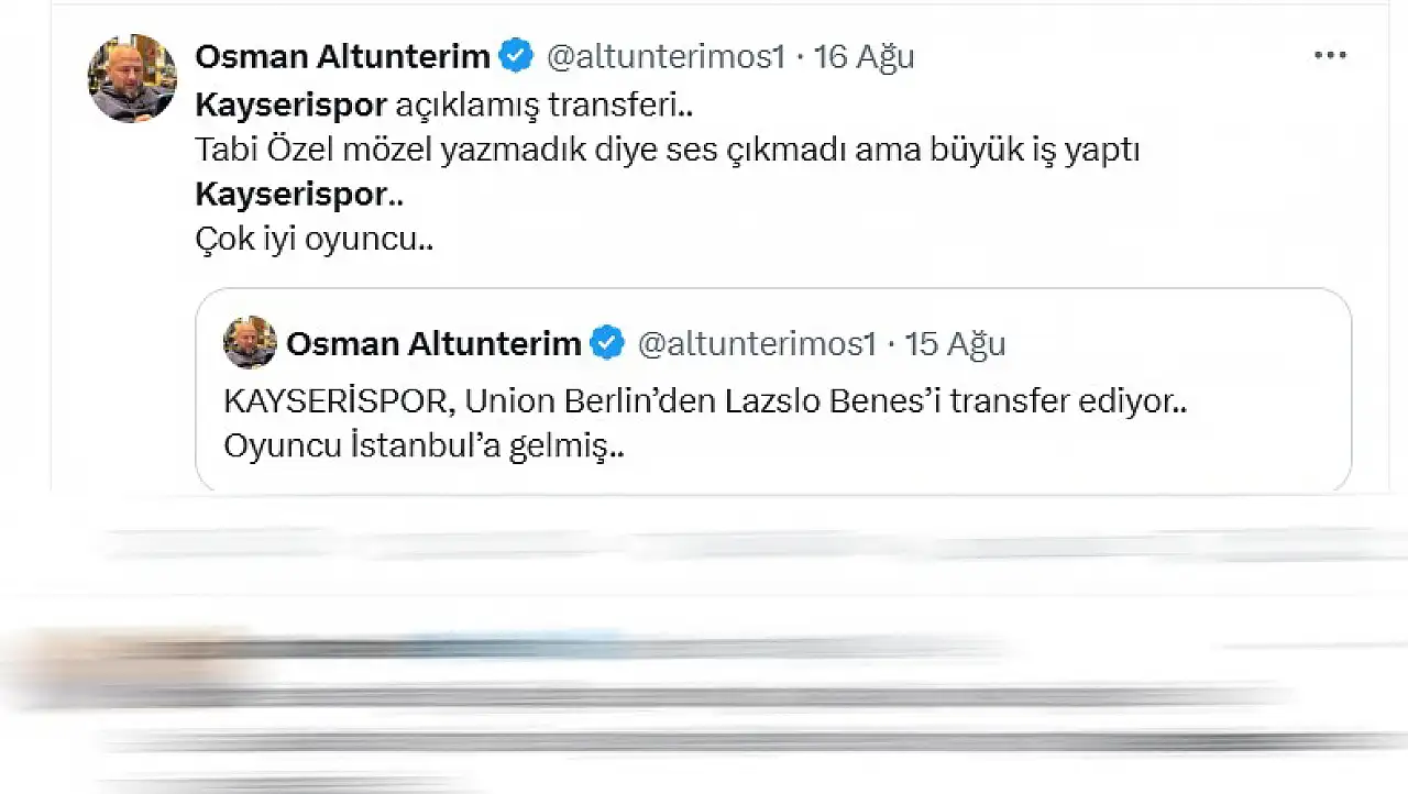 Benes, Kocaelispor maçında 90’ıncı dakikada takımına hayat verirken, Antalyaspor karşısında da 90+2’inci dakikada sahneye çıktı. Şu ana kadar gösterdiği yüksek performansla ve attığı kritik gollerle takıma büyük katkı sağlayan Benes, “Kayserispor’un en iyi transferi Laszlo Benes” dedirtti. Ünlü gazeteci Osman Altunterim, Benes transferini ilk duyuran isim olurken, “Kayserispor büyük iş başardı” yorumu yapmıştı. Altunterim'in paylaşımları Kayserispor camiası tarafından da dikkatle takip ediiiyor.