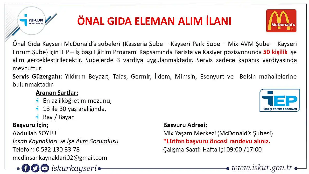 Dünyaca ünlü fast food firması McDonald's Kayseri'de 4 farklı alışveriş merkezinde bulunan şubelerine İŞKUR vasıtasıyla çok sayıda personel alımı gerçekleştirecek. Detaylar Kayseri Anadolu Haber'de...