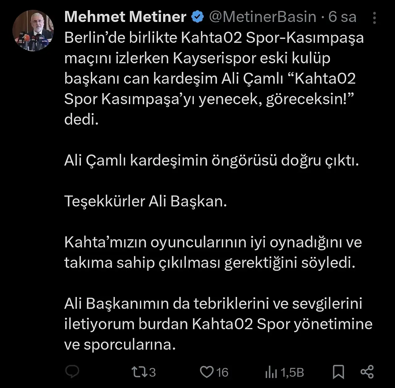 Metiner paylaşımında, “Berlin’de birlikte Kahta02 Spor-Kasımpaşa maçını izlerken Kayserispor eski kulüp başkanı can kardeşim Ali Çamlı, ‘Kahta02 Spor Kasımpaşa’yı yenecek, göreceksin!’ dedi. Ali Çamlı kardeşimin öngörüsü doğru çıktı. Teşekkürler Ali Başkan. Kahta’mızın oyuncularının iyi oynadığını ve takıma sahip çıkılması gerektiğini söyledi. Ali Başkanımın da tebriklerini ve sevgilerini iletiyorum buradan Kahta02 Spor yönetimine ve sporcularına” ifadelerini kullandı.