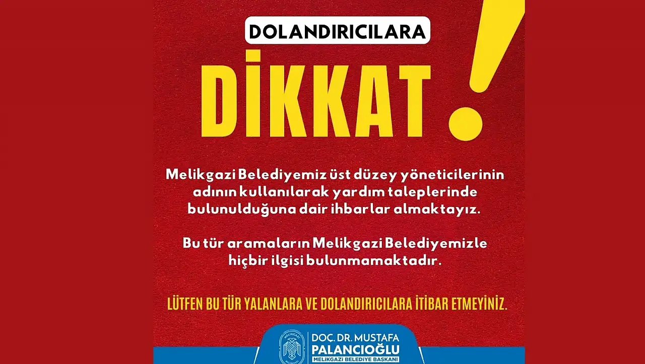 Melikgazi Belediyesi sosyal medya platformu üzerinden yaptığı açıklamada vatandaşları son dönemde oluşan yeni dolandırıcılık sistemine karşı uyardı. Yapılan paylaşımda, ‘Melikgazi Belediyemiz üst düzey yöneticilerin adının kullanılarak yardım taleplerinde bulunulduğuna dair ihbarlar almaktayız. Bu tür aramaların Melikgazi Belediyemizle hiçbir ilgisi bulunmamaktadır. Lütfen bu tür yalana ve dolandırıcılara itibar etmeyiniz’ ifadelerine yer verildi.