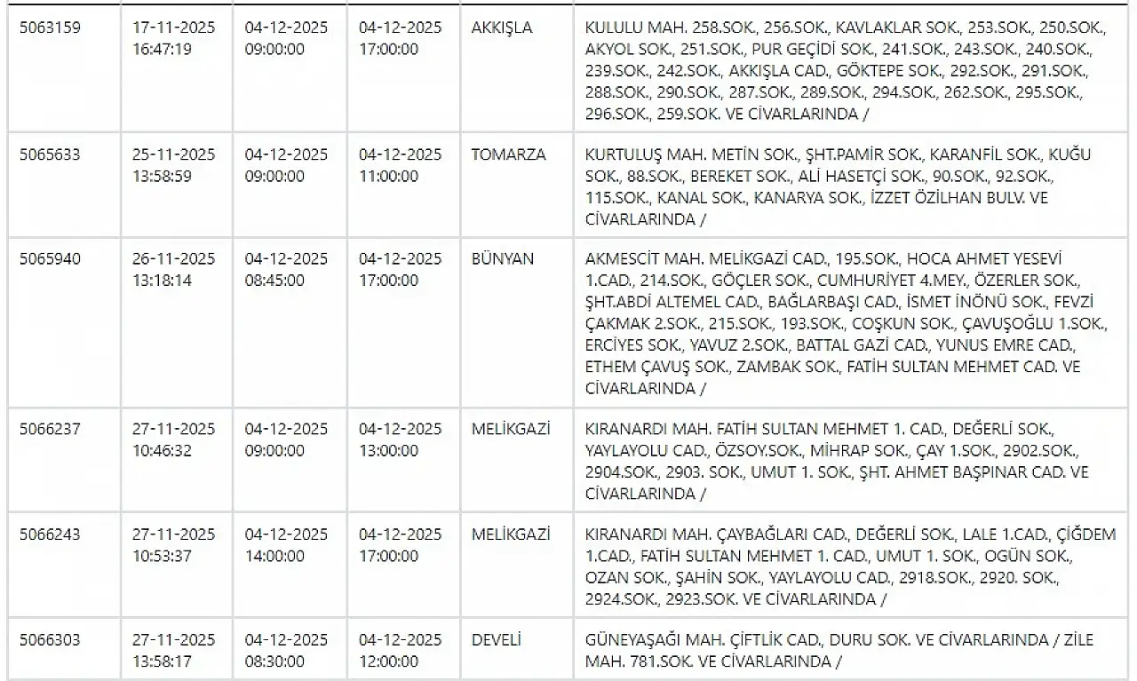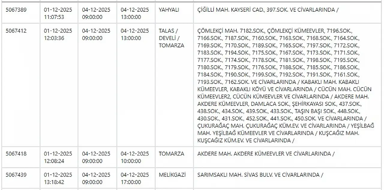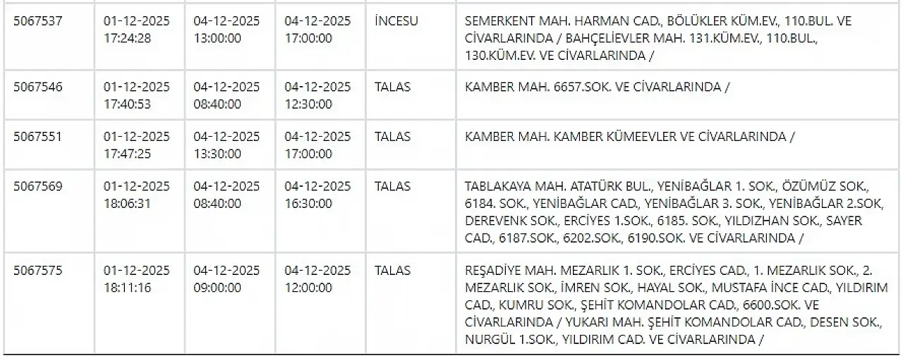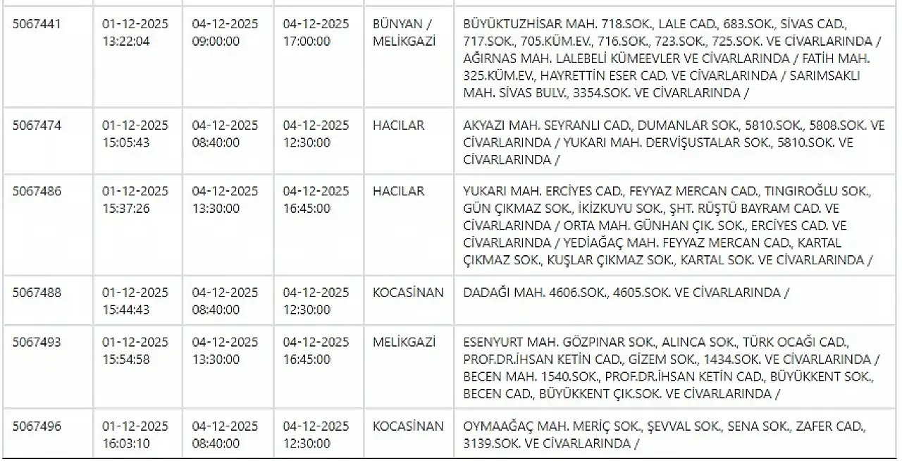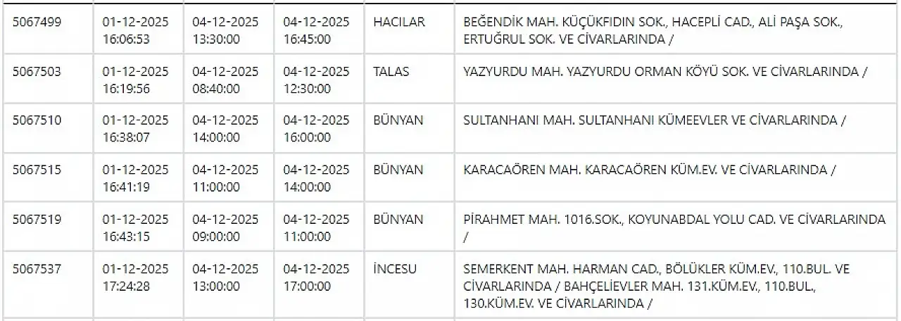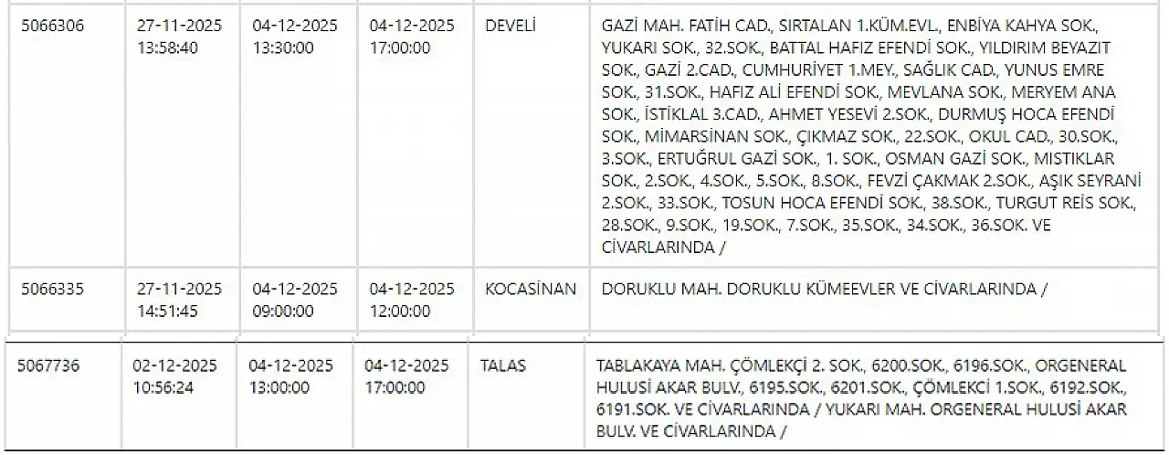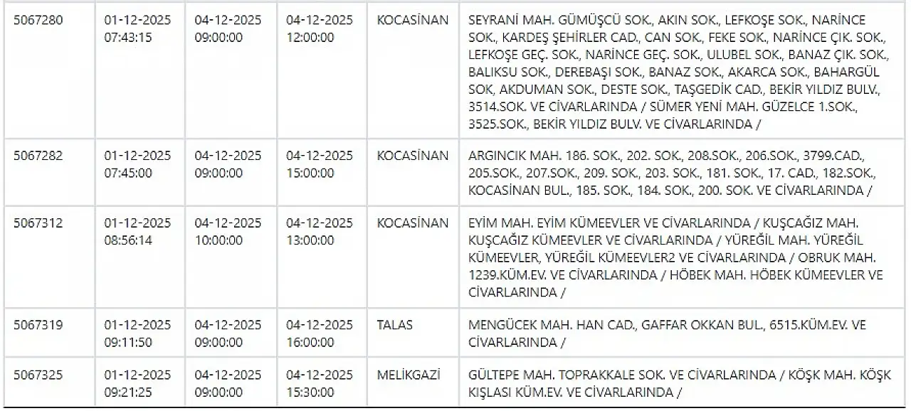 - Melikgazi, Kocasinan, Hacılar, Talas, Tomarza, Develi… KCETAŞ'tan önemli uyarı! 4 Aralık 2025